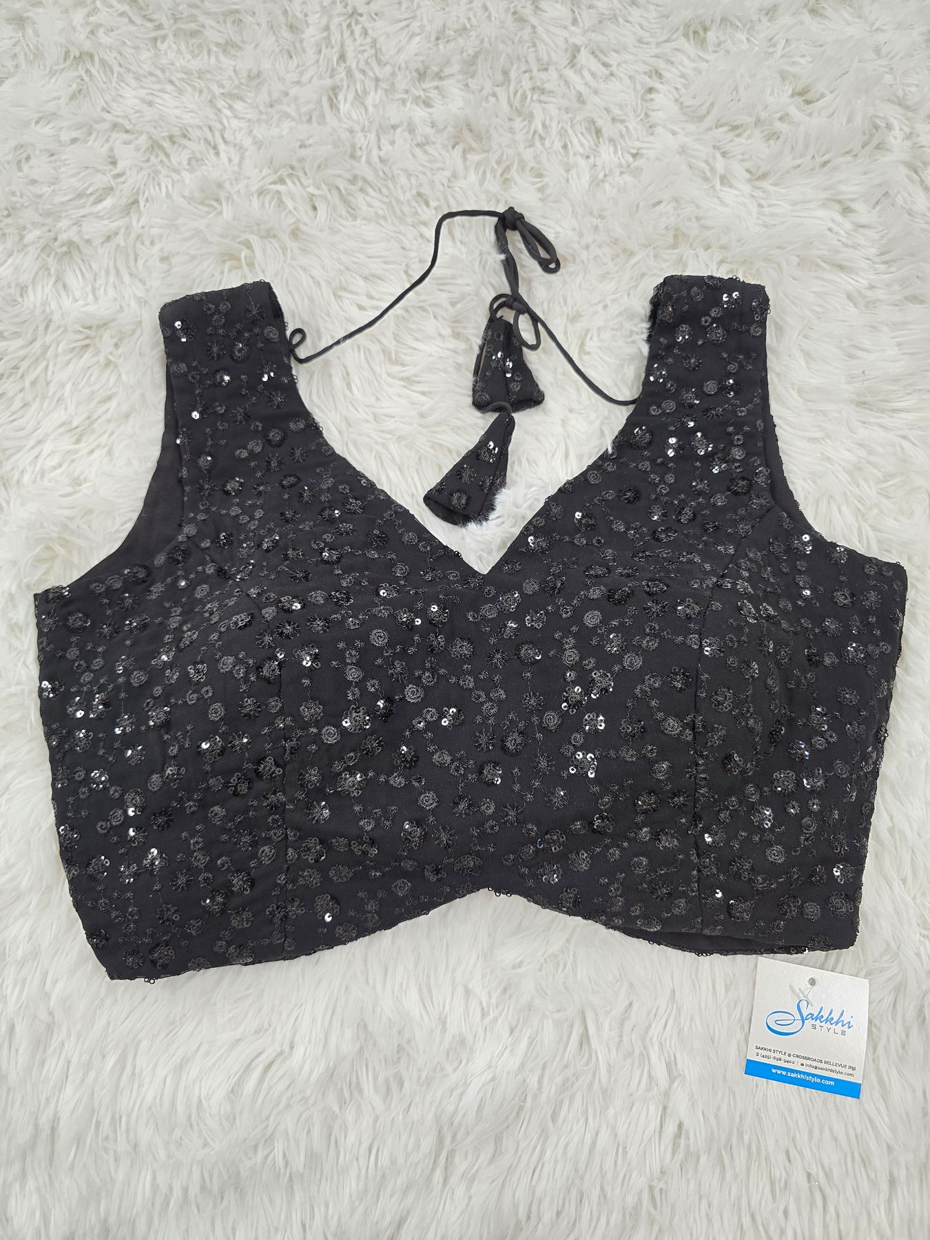 Black Sequin Embroidered Blouse – V Neck with Tie-Back & Extra Sleeve Material