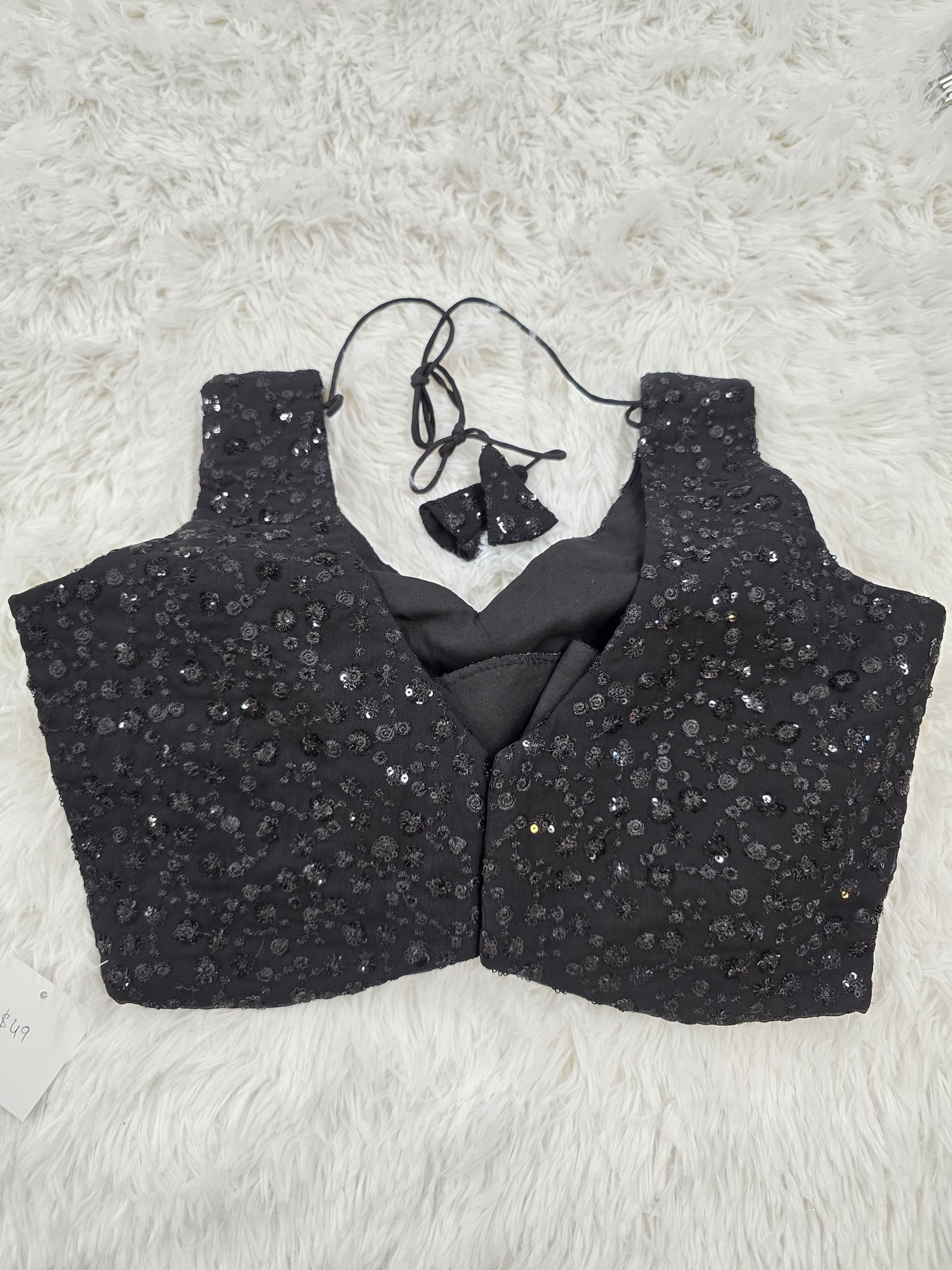 This elegant black blouse is beautifully crafted with all-over sequin embroidery, giving it a rich and festive look. The blouse features a flattering V-neckline at the front and back, complete with stylish tie-back tassels for added charm. Perfect to pair with sarees or lehengas for parties, weddings, or festive occasions.