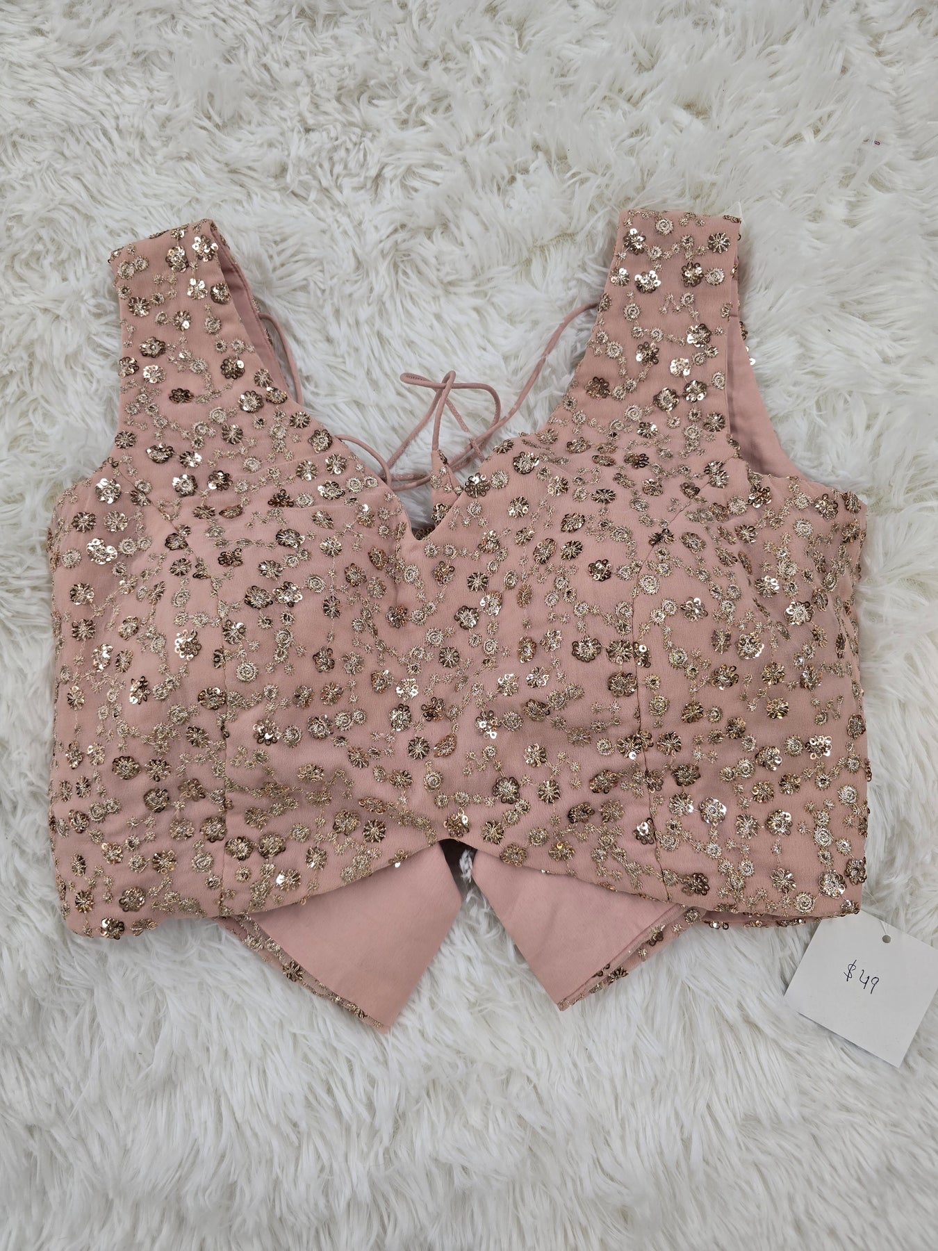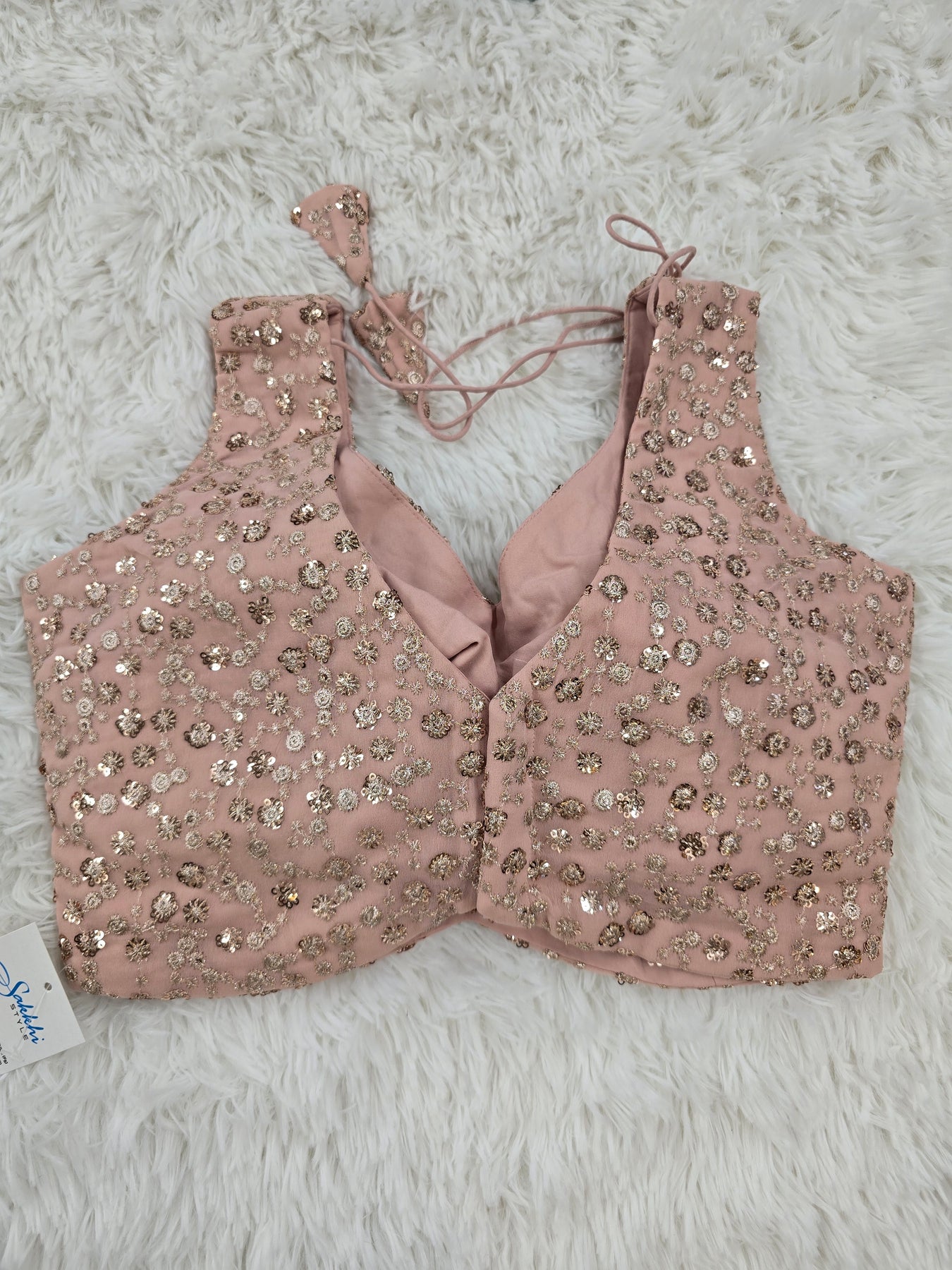 Add a touch of elegance to your ethnic wardrobe with this stunning blush pink blouse, beautifully detailed with shimmering sequin and thread embroidery. Designed with a sleeveless cut and tie-back closure, it offers a flattering fit and a chic festive look. The padded and well-structured design ensures comfort, while the delicate floral sequin work enhances its overall richness. This versatile blouse pairs perfectly with sarees, lehengas, and festive skirts, making it an ideal choice for weddings, receptions, and cultural celebrations. Matching sleeve fabric is also included, allowing you the option to add sleeves if desired.