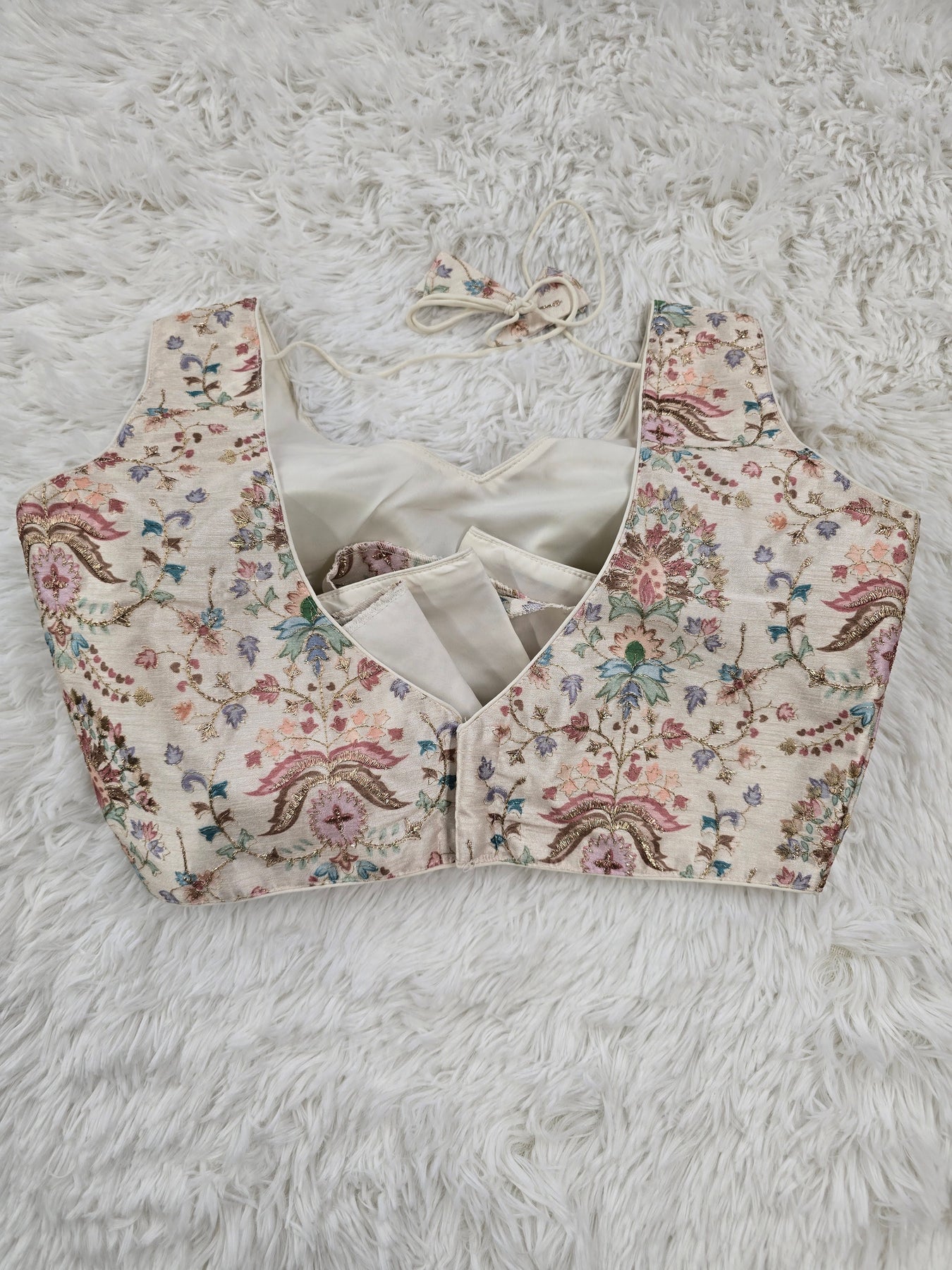 Cream Woven Silk Readymade Blouse – V-Neck Design with Pastel Floral Weaving & Tassel Tie-Back