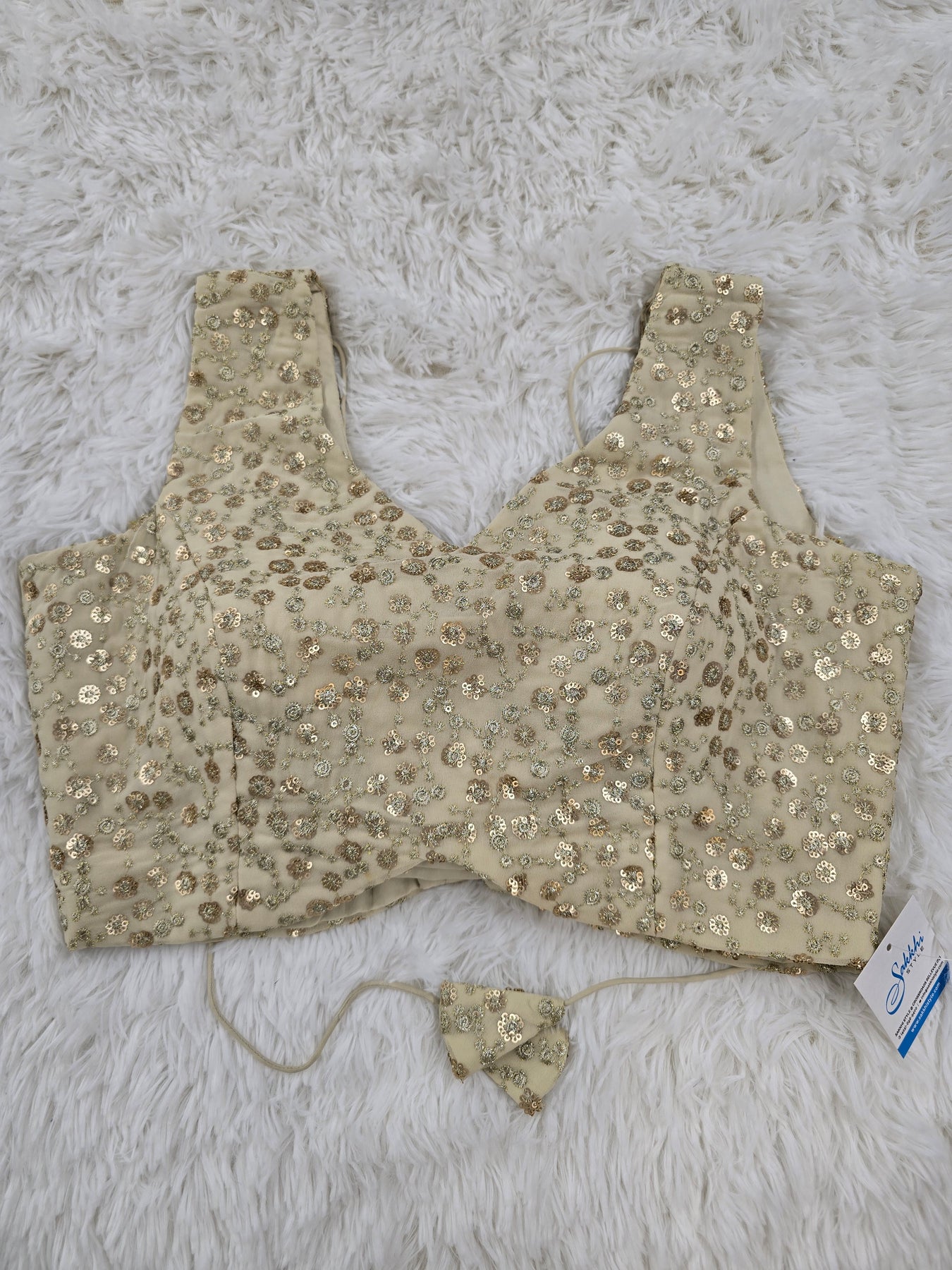 This golden beige sequin blouse is a perfect statement piece for festive occasions, weddings, or parties. Featuring shimmering sequins intricately embroidered on a soft fabric base, it creates a rich and elegant appeal. The back tie-up with tassels adds a traditional charm, while the included sleeve fabric offers customization for those who prefer extended coverage. With a comfortable fit and versatile style, this blouse pairs beautifully with sarees and lehengas.