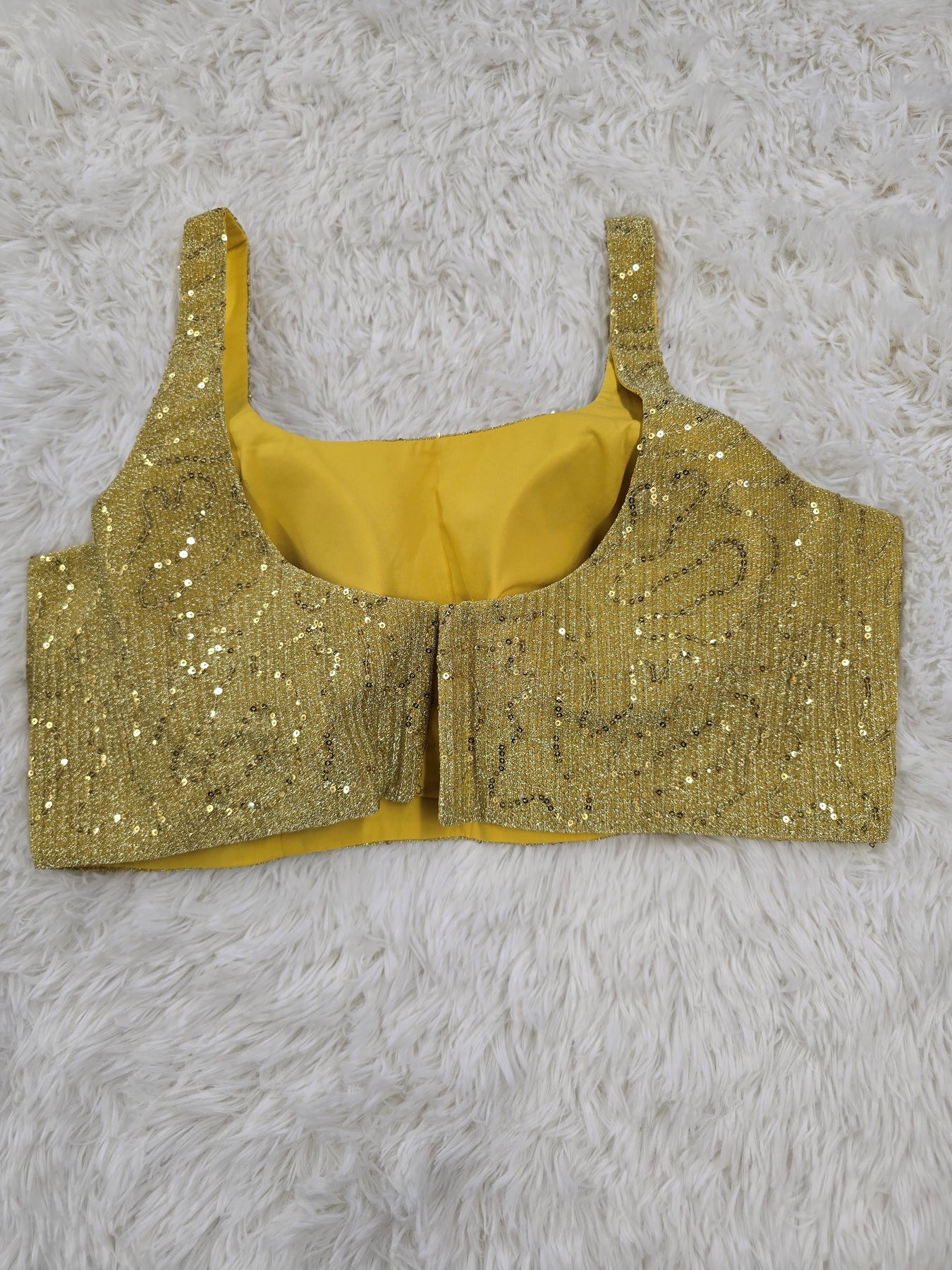 This golden blouse is beautifully crafted with all-over sequin embroidery in delicate swirling patterns, adding a sparkling charm to your outfit. Designed in a sleeveless style with a sweetheart neckline, it comes with comfortable lining for a smooth fit. The blouse also features margin on both sides to extend up to 2 inches, ensuring flexibility in size.