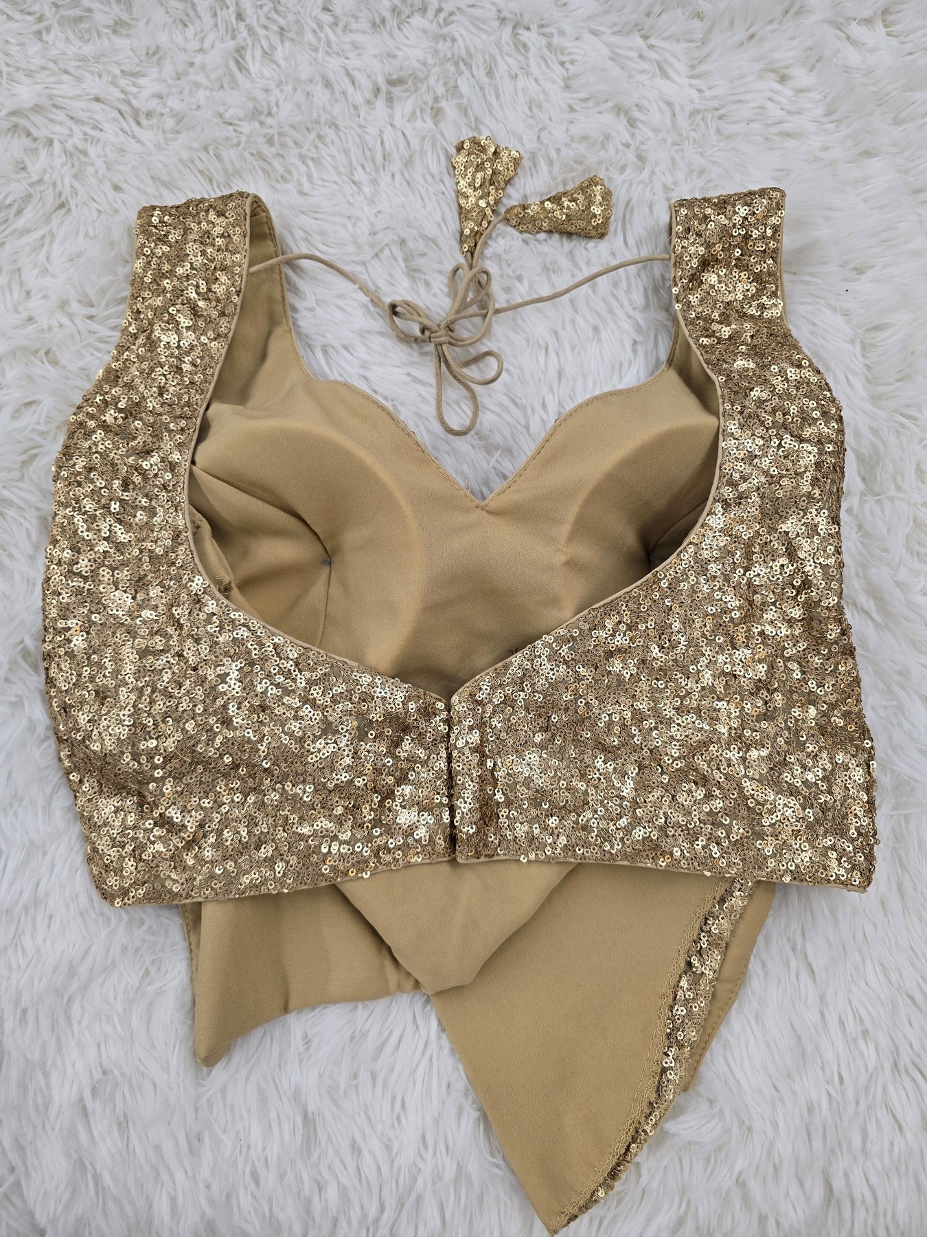 Golden Sequin V-Neck Blouse – Padded, Back-Open with Tassel Tie-Up & Sleeve Fabric Included
