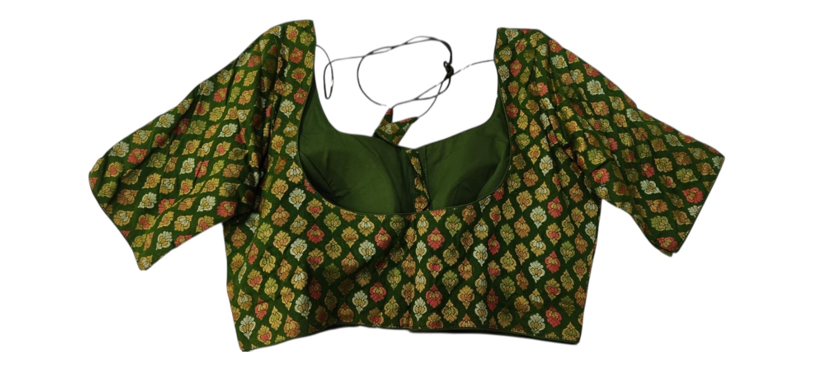 A classic green silk blouse decorated with repeating gold butta motifs. Featuring elbow-length sleeves, a scoop neckline, and a traditional back open design, this blouse is perfect for temple wear, festivals, and traditional occasions.