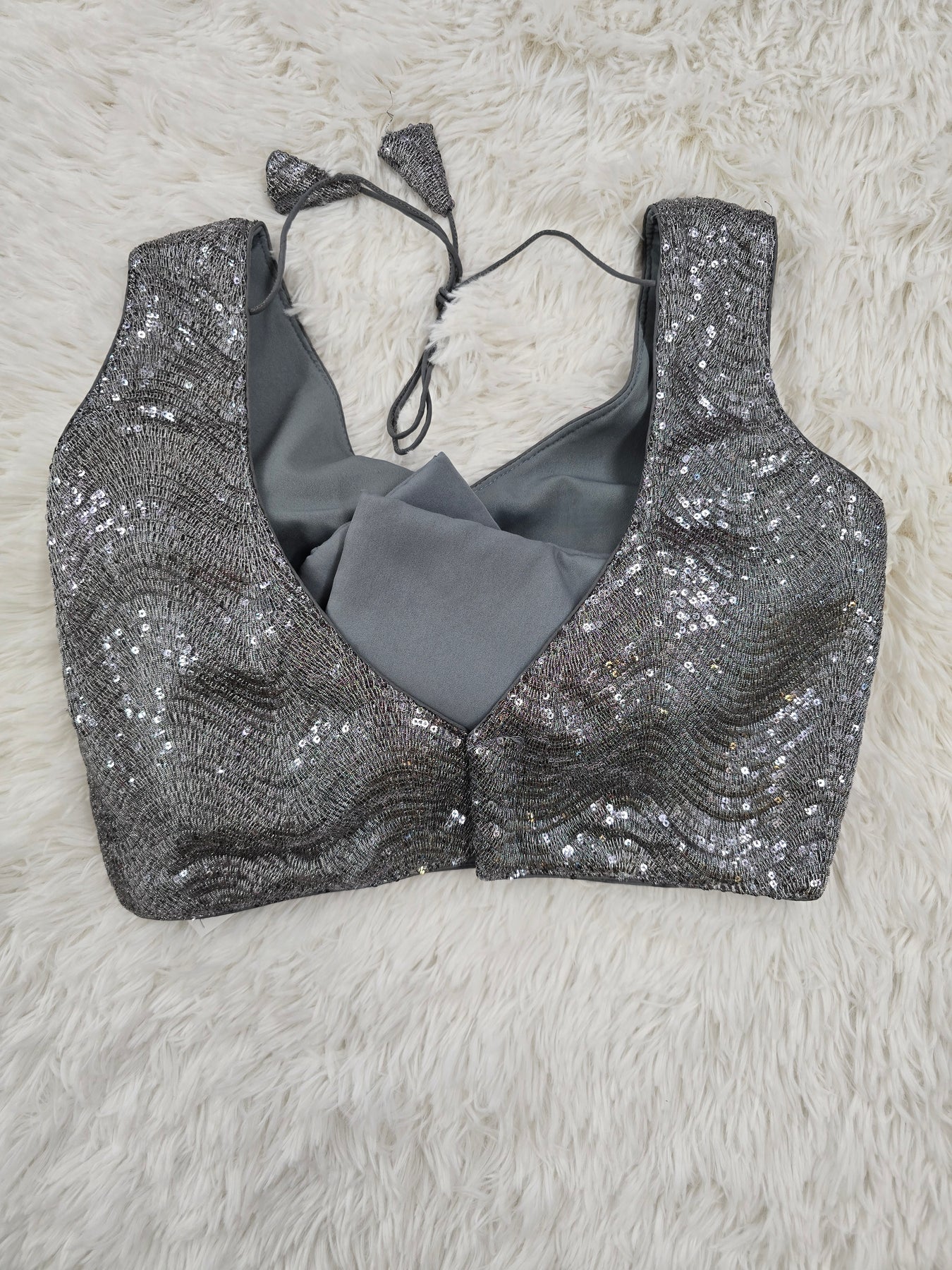 Radiate contemporary glamour with this stunning gunmetal sequin blouse. Designed with shimmering sequins in a wave pattern, this blouse exudes luxury and sophistication. The structured padded fit offers a flattering shape, while the back hook closure and elegant tie-back tassels provide comfort and secure styling. Its metallic sheen makes it a versatile pairing with sarees or lehengas for weddings, sangeet nights, and cocktail parties.