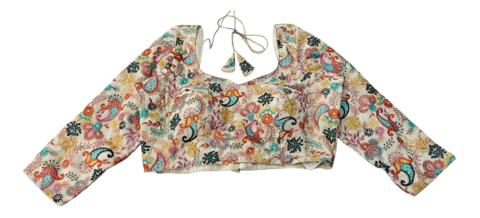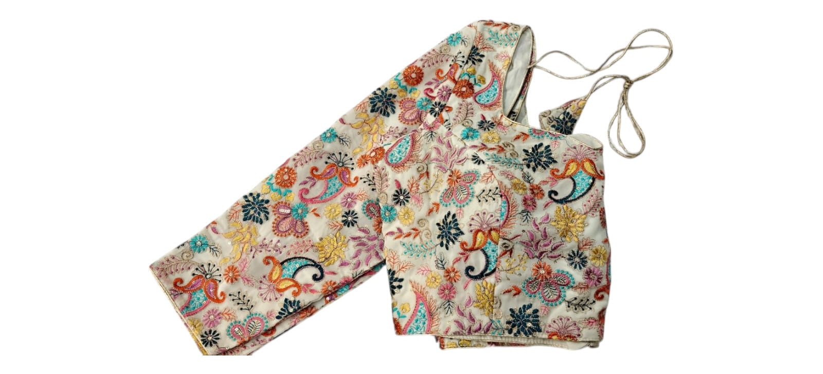 An elegant ivory silk blouse richly embroidered with multicolour floral and paisley motifs. Featuring elbow-length sleeves, a scoop neckline, and a back open dori fastening, this blouse is ideal for weddings and special occasions.
