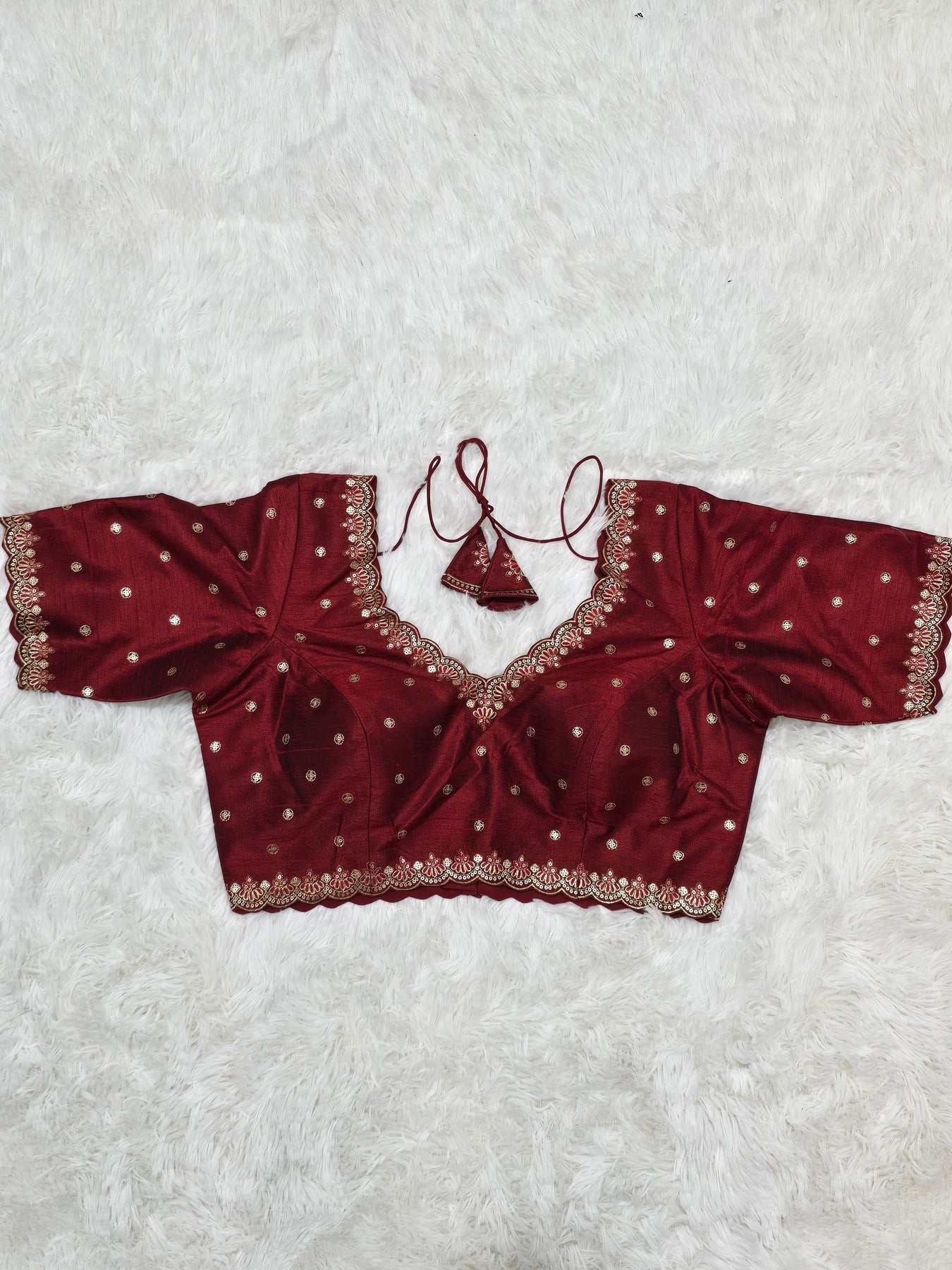 This rich maroon embroidered silk blouse brings a regal charm to any traditional outfit. Made from premium silk fabric, it features elegant zari and mirror work embroidery arranged delicately across the body and sleeves. The V-shaped neckline with a scalloped embroidered border adds a graceful touch, while the deep back with dori (thread-tie) tassels completes the look with ethnic finesse. Perfect for festive occasions, weddings, and parties when paired with sarees or lehengas.