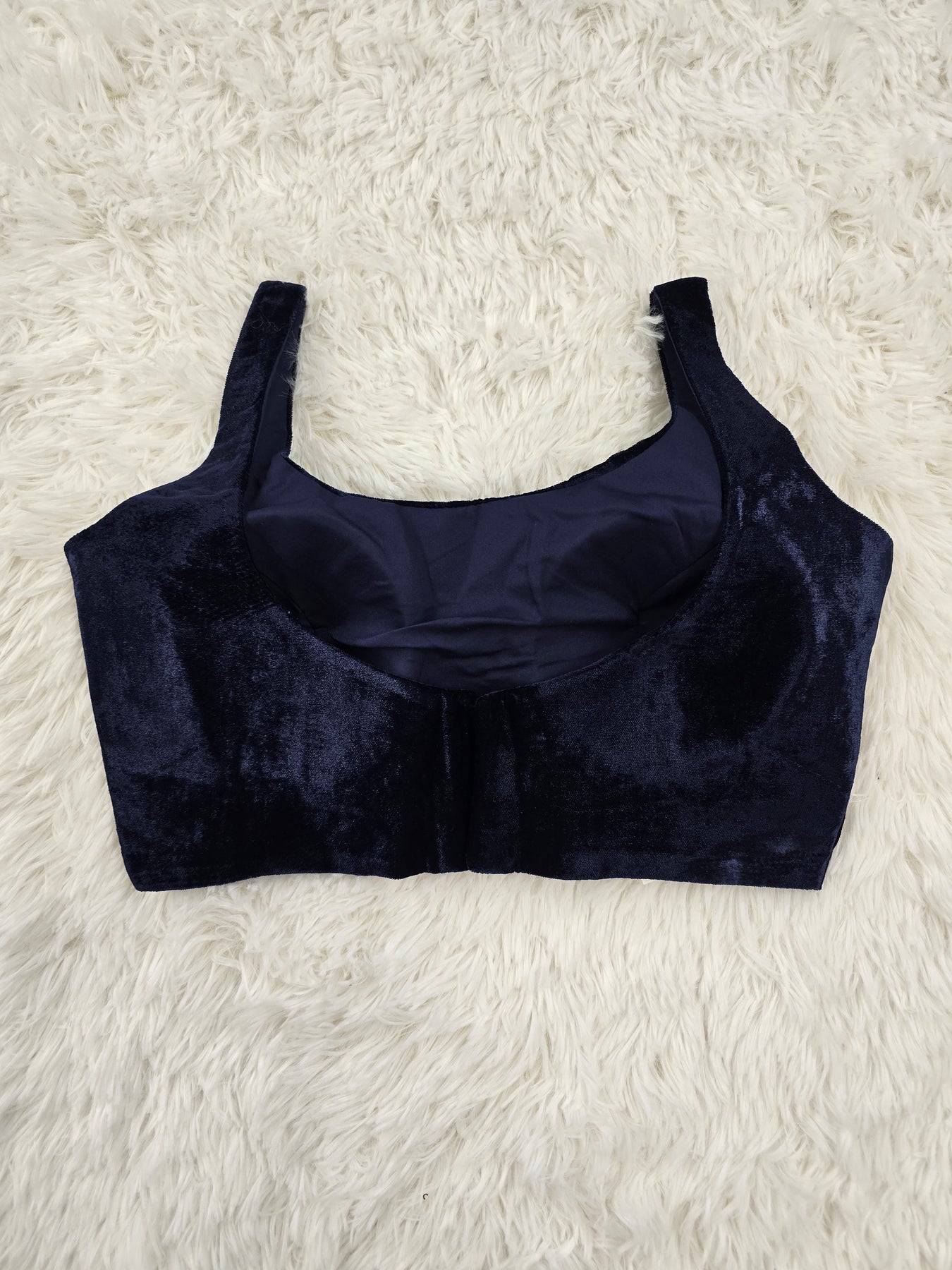 This navy blue velvet blouse is a perfect pick for elegant and festive looks. Designed with a sweetheart neckline, it enhances the style quotient while maintaining comfort. The blouse comes with a back hook opening for a secure fit. Crafted from soft velvet fabric, it features padded cups for added support and a smooth finish. The blouse also includes margin for easy size adjustments.