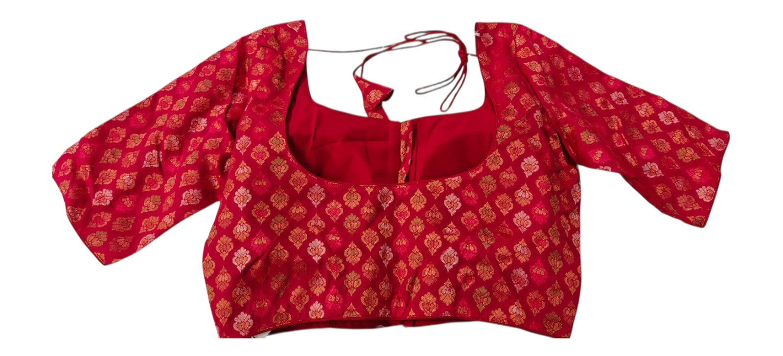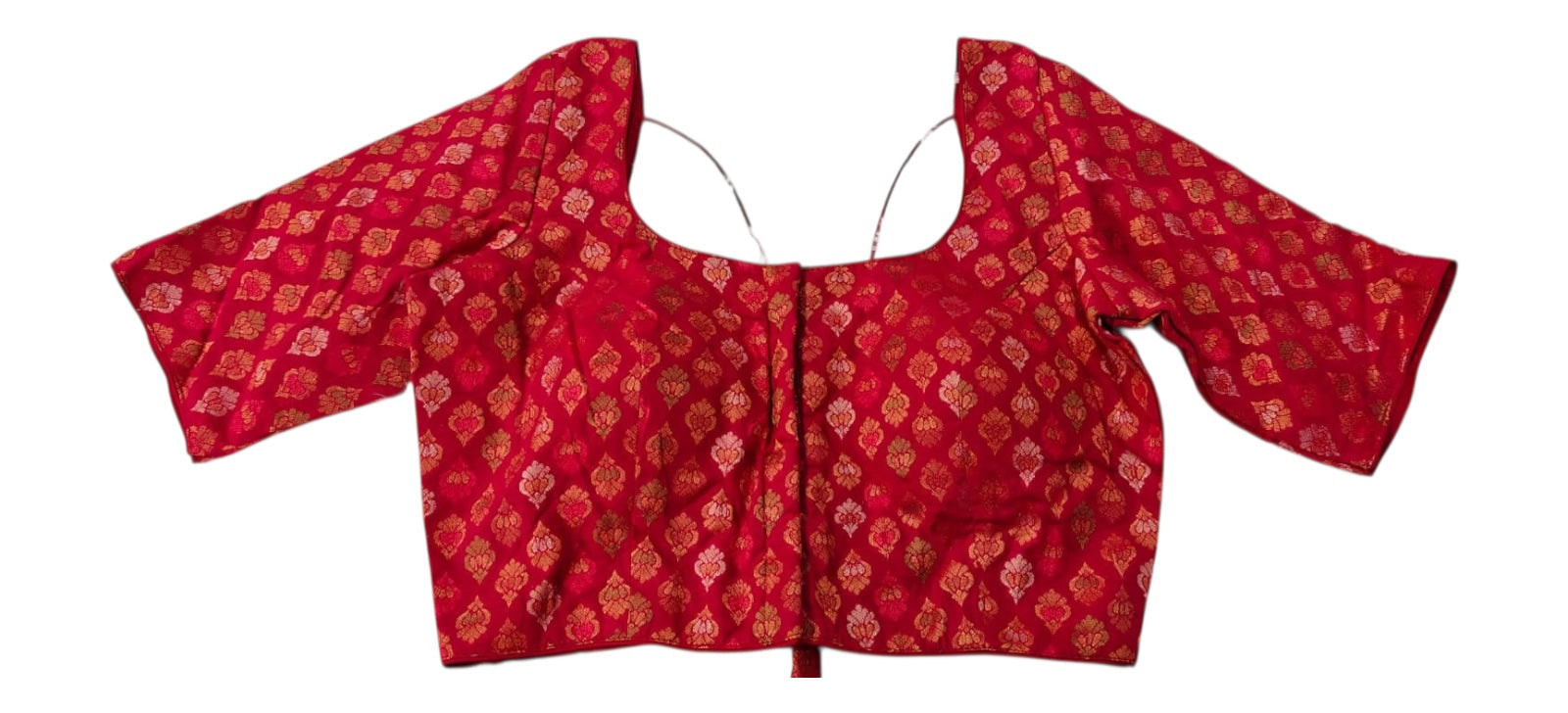 This rich red silk blouse is decorated with traditional gold butta motifs throughout. Featuring elbow-length sleeves, a scoop neckline, and a structured fit, it delivers a classic South Indian aesthetic. Finished with a back open dori for ease of wear.