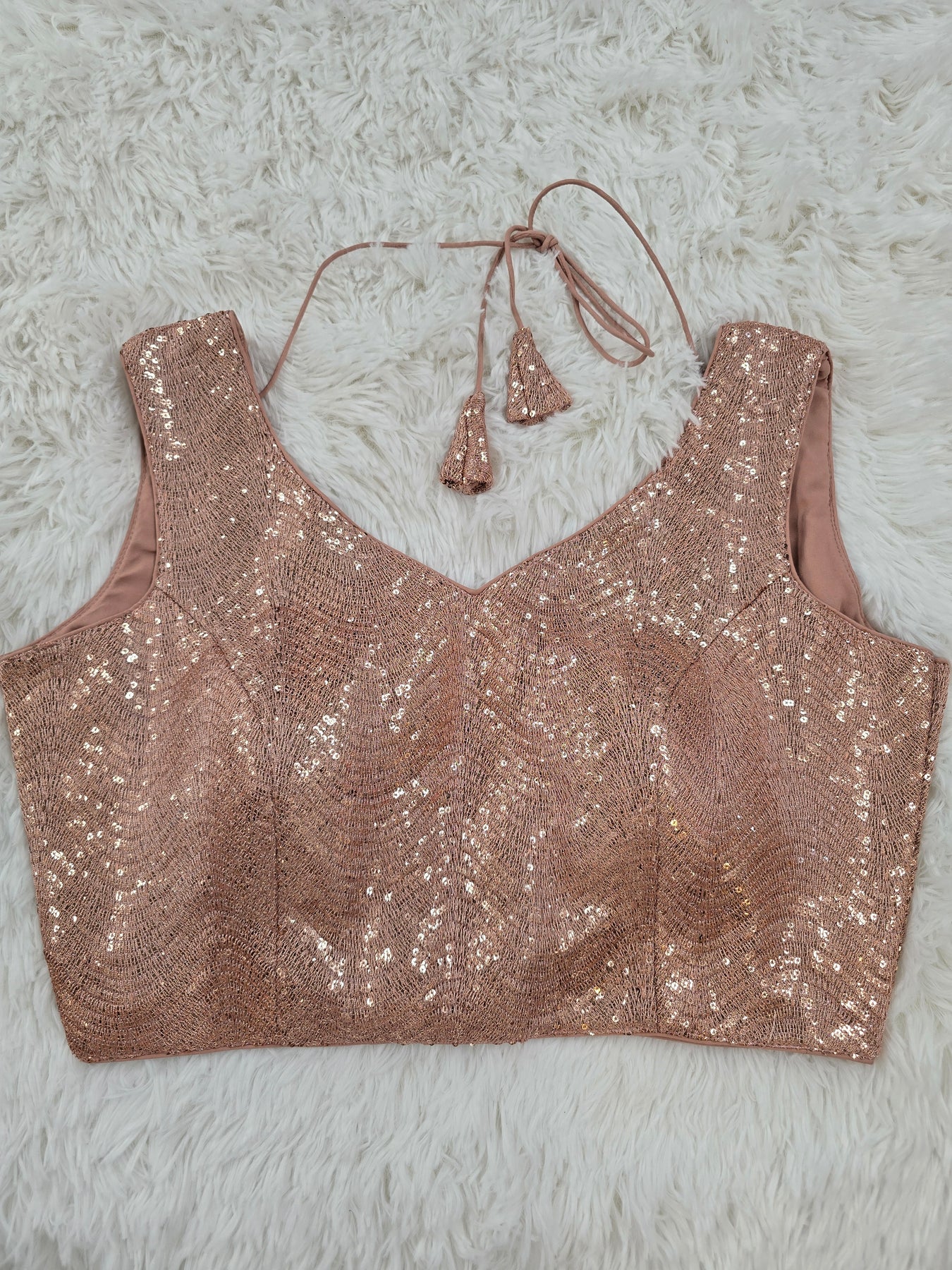 Step into elegance with this glamorous rose gold sequin blouse, designed with a flattering V-neckline and sleeveless cut. The blouse features shimmering all-over sequin work that adds sparkle to your festive look. Its back-open style with hook closure and tie-up tassels ensures a secure yet stylish fit. Perfect for weddings, receptions, and parties, this blouse pairs effortlessly with sarees, lehengas, or festive skirts.It also comes with margins on both sides, allowing you to extend the size by up to 2 inches if needed.