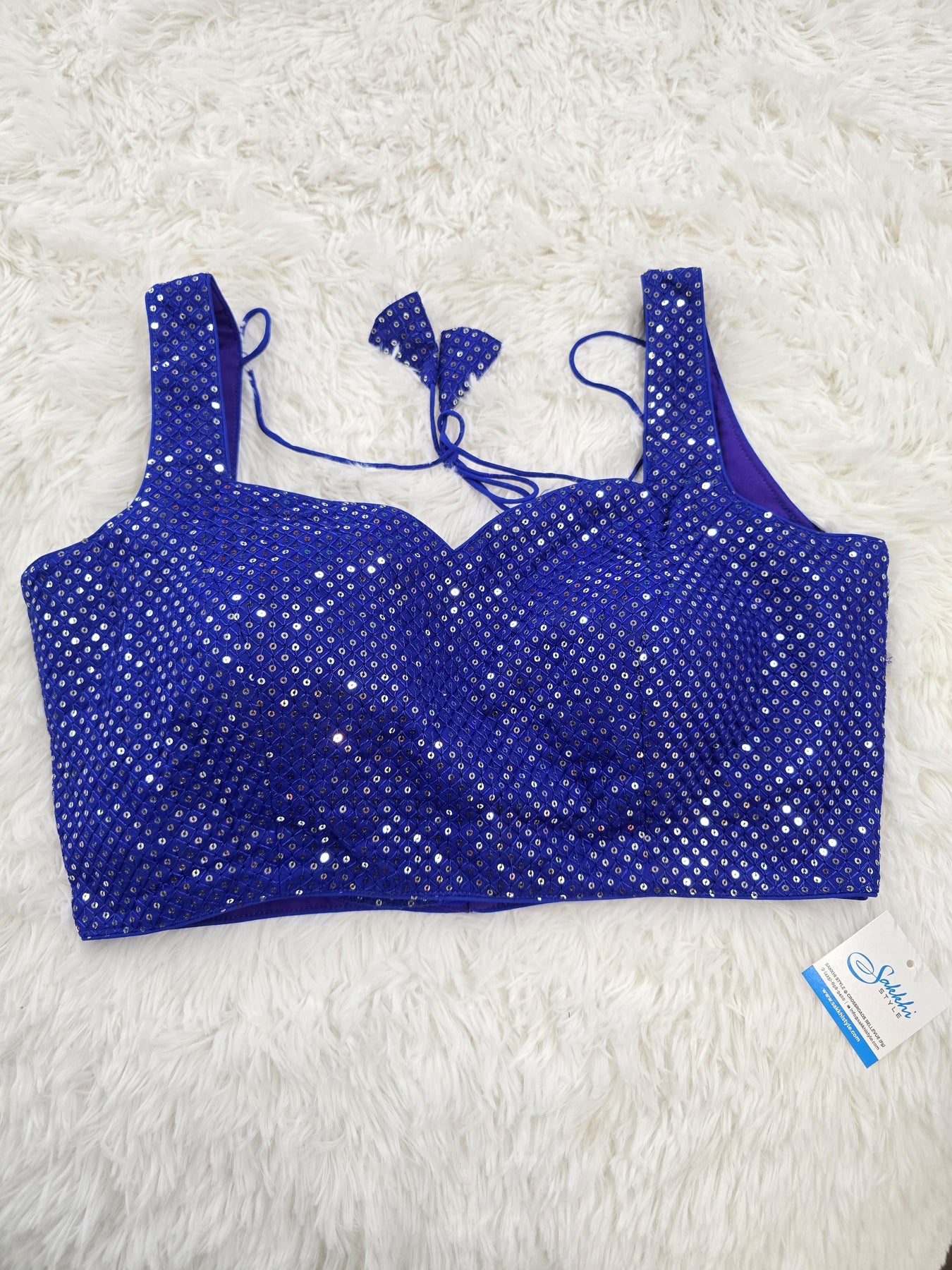 Elevate your ethnic wardrobe with this royal blue sequins embroidered sleeveless blouse, designed for both glamour and comfort. The sweetheart neckline enhances elegance, while the shimmering sequin work adds festive charm. It comes with extra fabric for sleeves, giving you the choice to style it sleeveless or stitched with sleeves. The blouse also includes a margin of up to 2 inches on both sides, allowing for an easy fit adjustment. Finished with back hook opening and tie-up tassels for added style, this blouse is a versatile pick for sarees and lehengas.