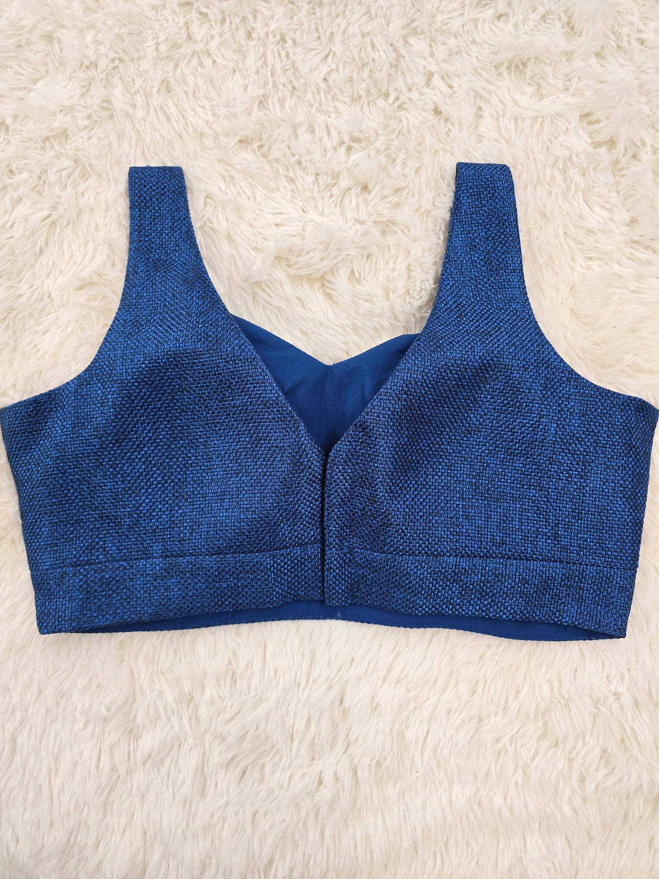 This royal blue blouse is crafted in a rich textured fabric, designed to add sophistication to your ethnic wardrobe. The sleeveless cut and neat tailoring give it a contemporary look, while the back-open style with hook closure ensures comfort and style. Its striking blue shade makes it a versatile match with sarees, lehengas, and festive skirts. The blouse also comes with margins on both sides, allowing you to extend the size by up to 2 inches for a customizable fit.