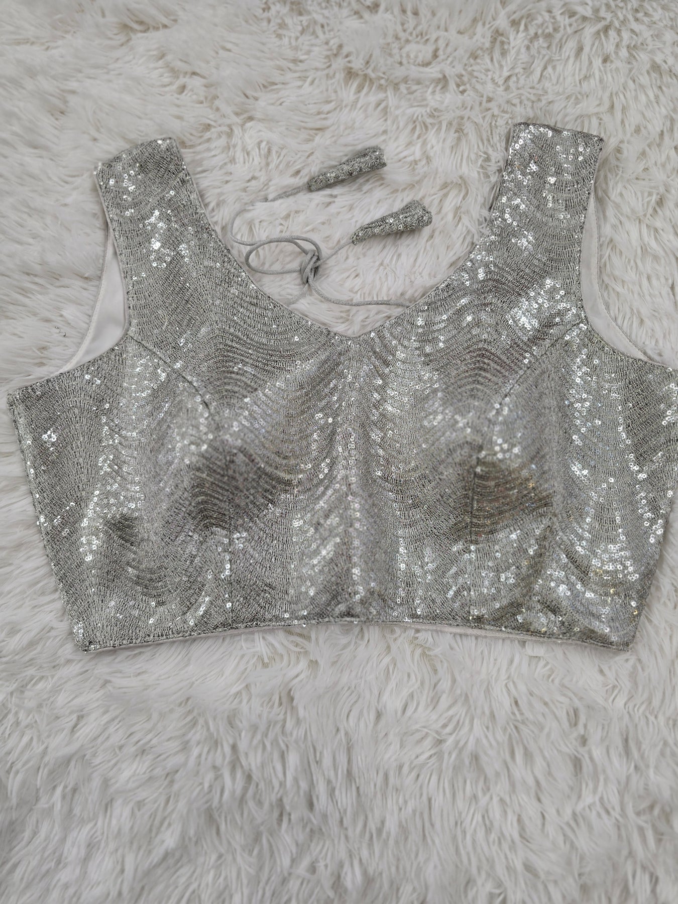 Silver Sequin Readymade Blouse – Shimmering Padded Designer Blouse with Tie-Back Tassels