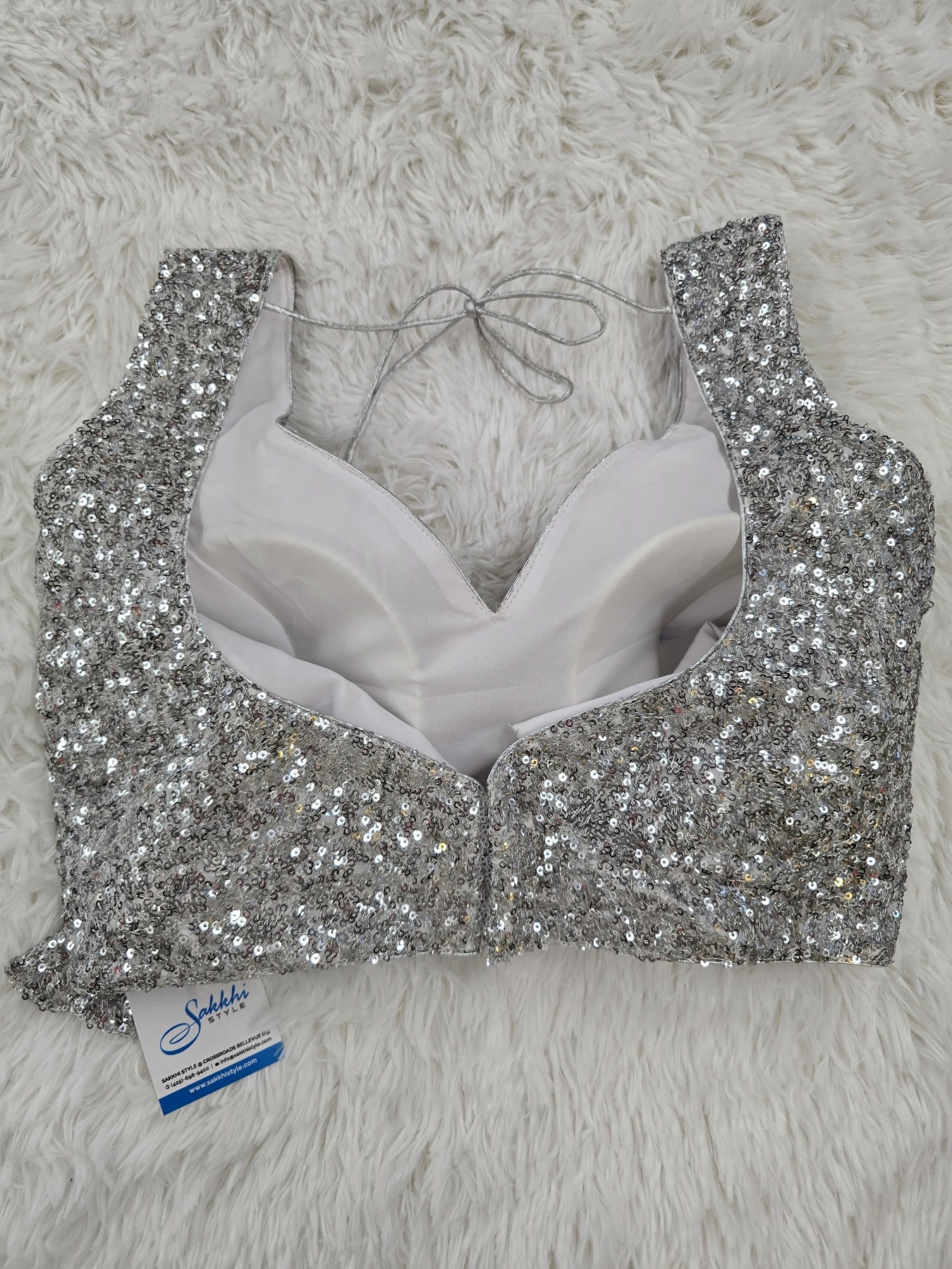 Shimmer and shine with this silver sequin blouse, designed to add instant glamour to any festive or party look. The blouse features a sparkling all-over sequin design that beautifully catches the light, making it a perfect statement piece. The V neckline in the front and back-open design with tie-up tassels give it a chic and stylish finish, while the sleeveless cut keeps it modern and versatile. Ideal for pairing with sarees, lehengas, or skirts for weddings, receptions, and evening parties.