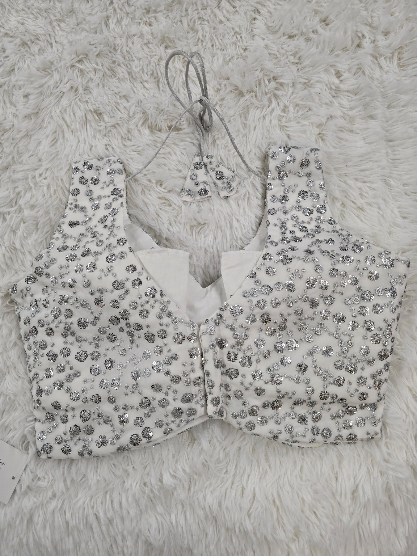 This elegant white blouse is beautifully adorned with all-over silver sequin embroidery, adding a rich shimmer and festive charm. Designed with a sleeveless cut and a round front neck paired with a deep V-back and tie-up tassels, it offers both comfort and sophistication. The blouse comes with extra sleeve material, giving you the flexibility to add sleeves if desired. Perfect to pair with sarees or lehengas, this blouse is a versatile addition to any festive or partywear collection.