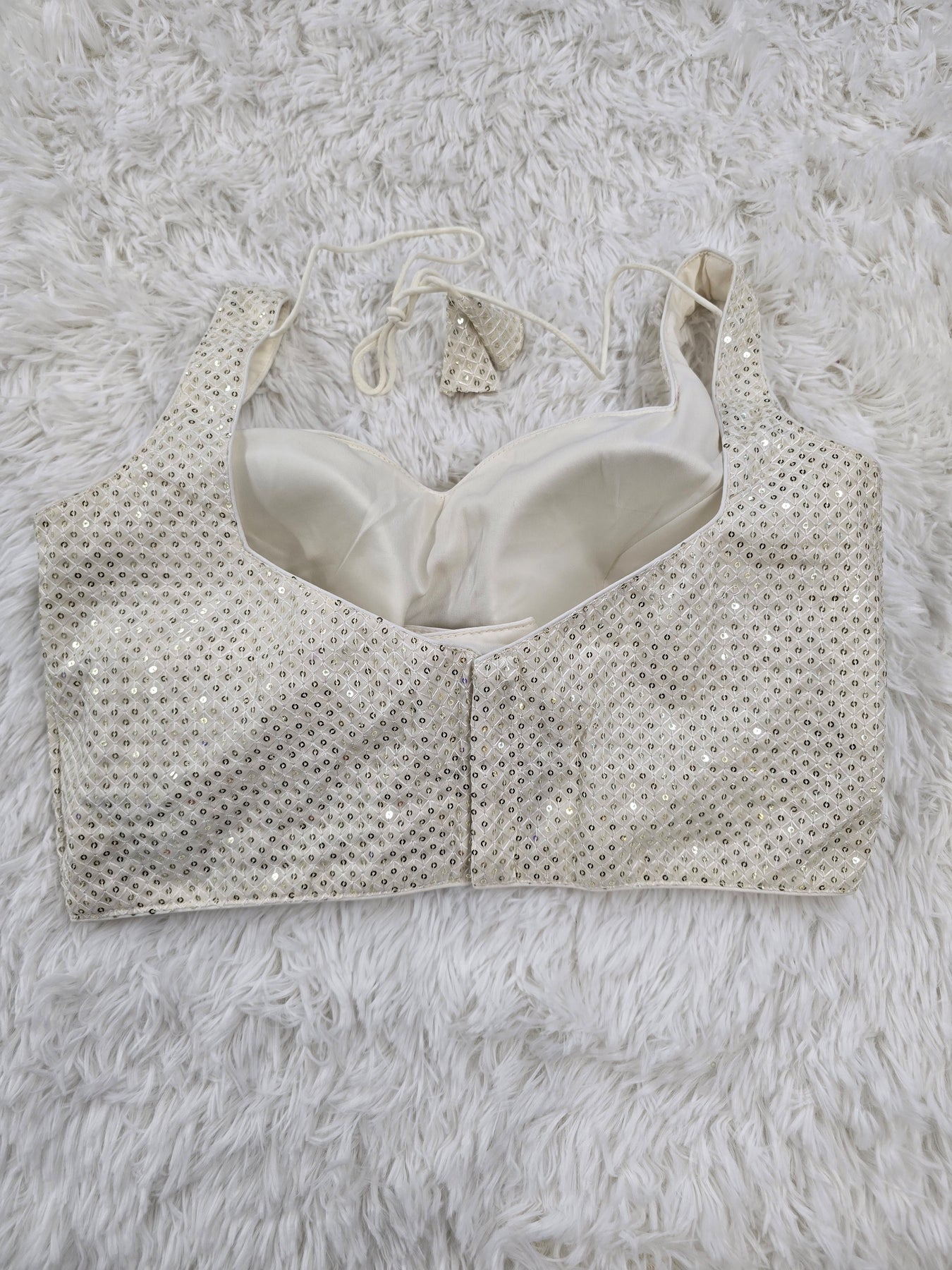 This white blouse is beautifully adorned with all-over sequin embroidery in a diamond pattern, creating a radiant yet graceful look. Designed with a sleeveless cut and sweetheart neckline, it adds a modern touch while remaining versatile for traditional pairings with sarees and lehengas. The blouse is tailored for comfort and convenience with a back hook opening.