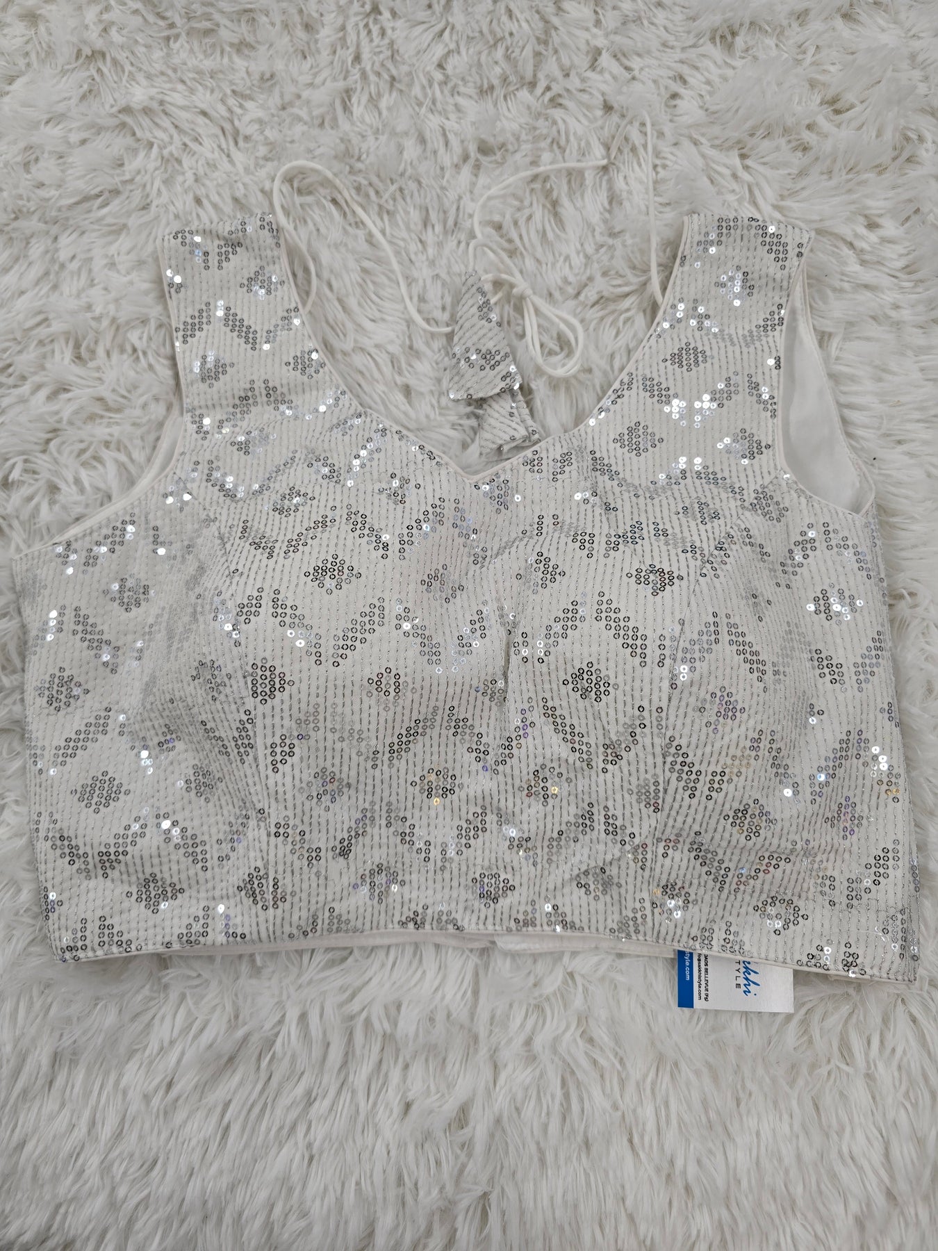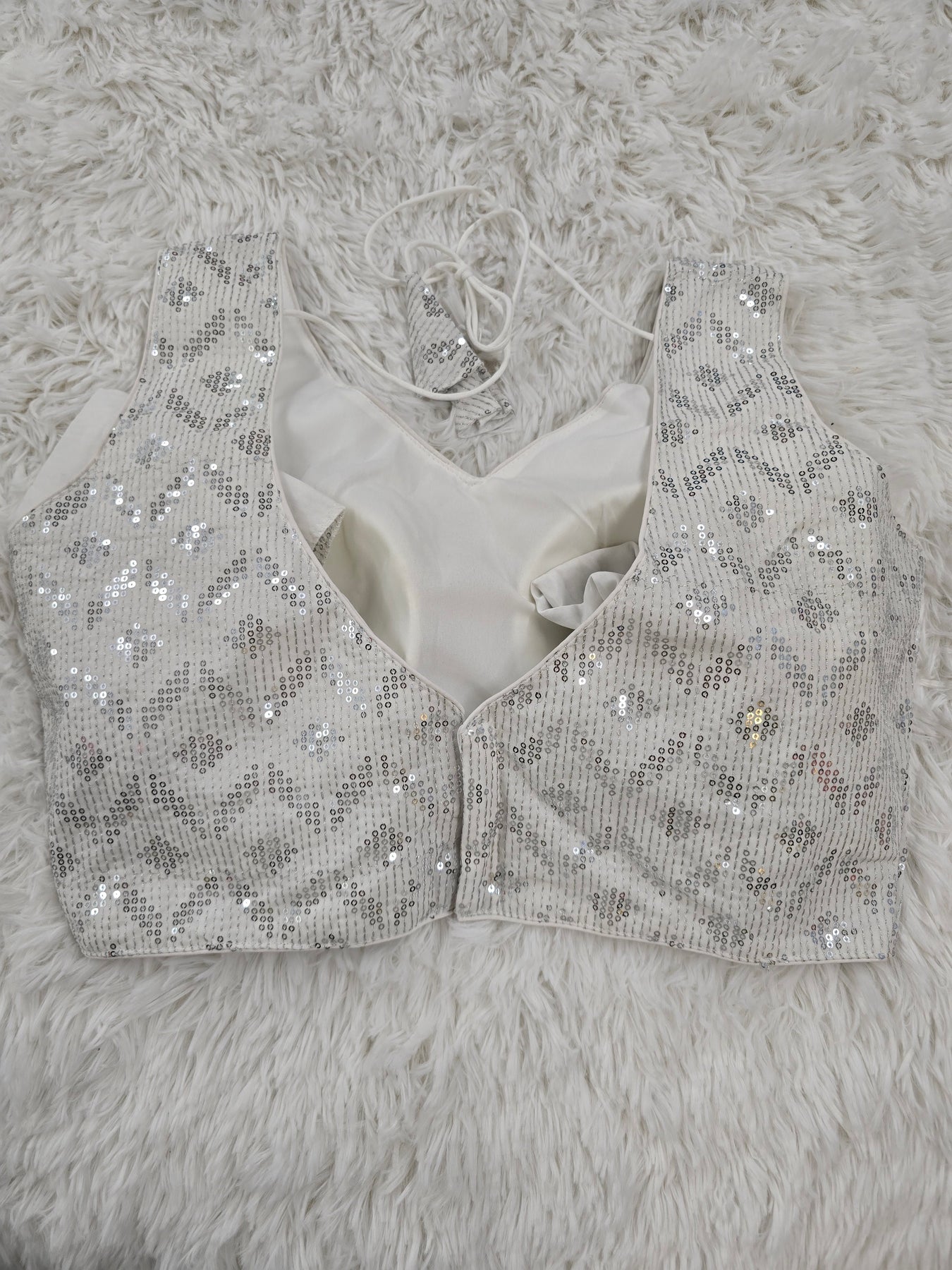 Shine in elegance with this white sequin blouse, featuring an all-over sequin design that adds sparkle and sophistication to your festive look. The blouse comes with a V neckline in the front and a back-open hook closure with tie-up tassels, combining modern style with a touch of tradition. The sleeveless cut and shimmering sequins make it the perfect choice for weddings, parties, and receptions, effortlessly pairing with sarees and lehengas.Comes with extra matching fabric to stitch sleeves if desired.