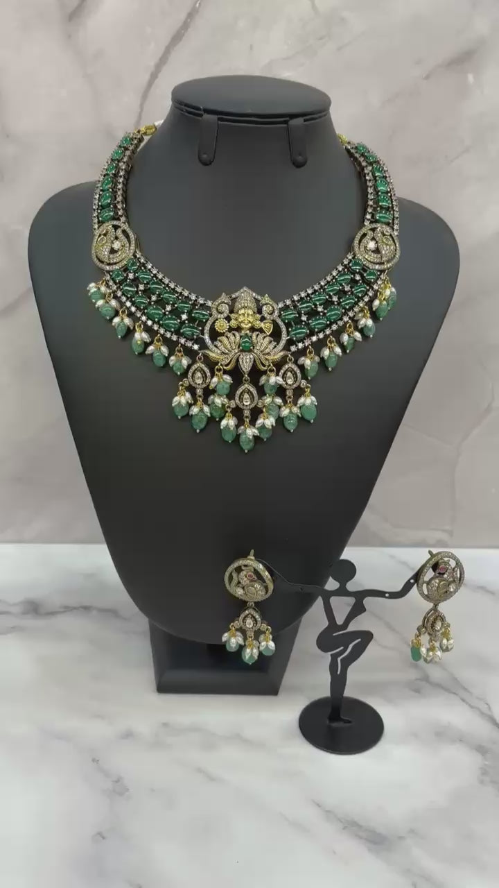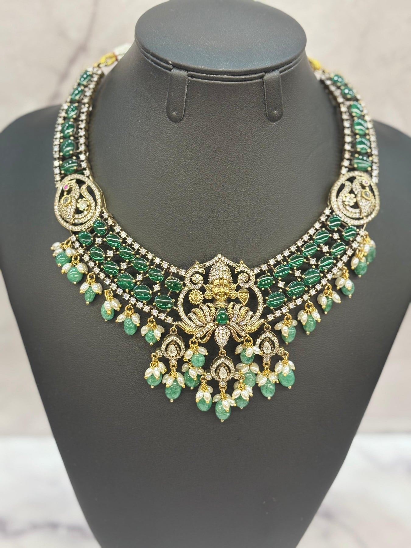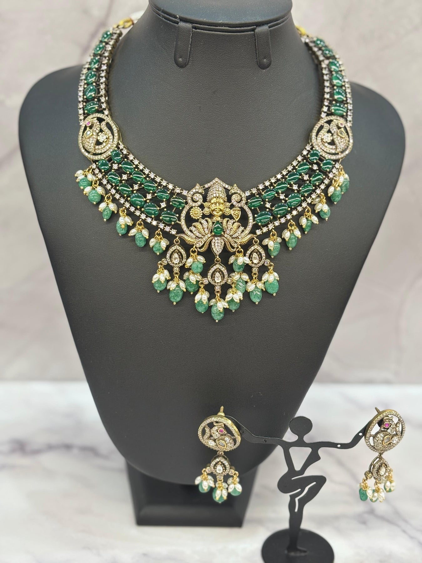 A statement choker-style necklace adorned with multiple rows of deep green beads and shimmering crystal accents. The central floral motif is beautifully enhanced with dangling green beads and pearl highlights, giving it a regal and luxurious appearance.