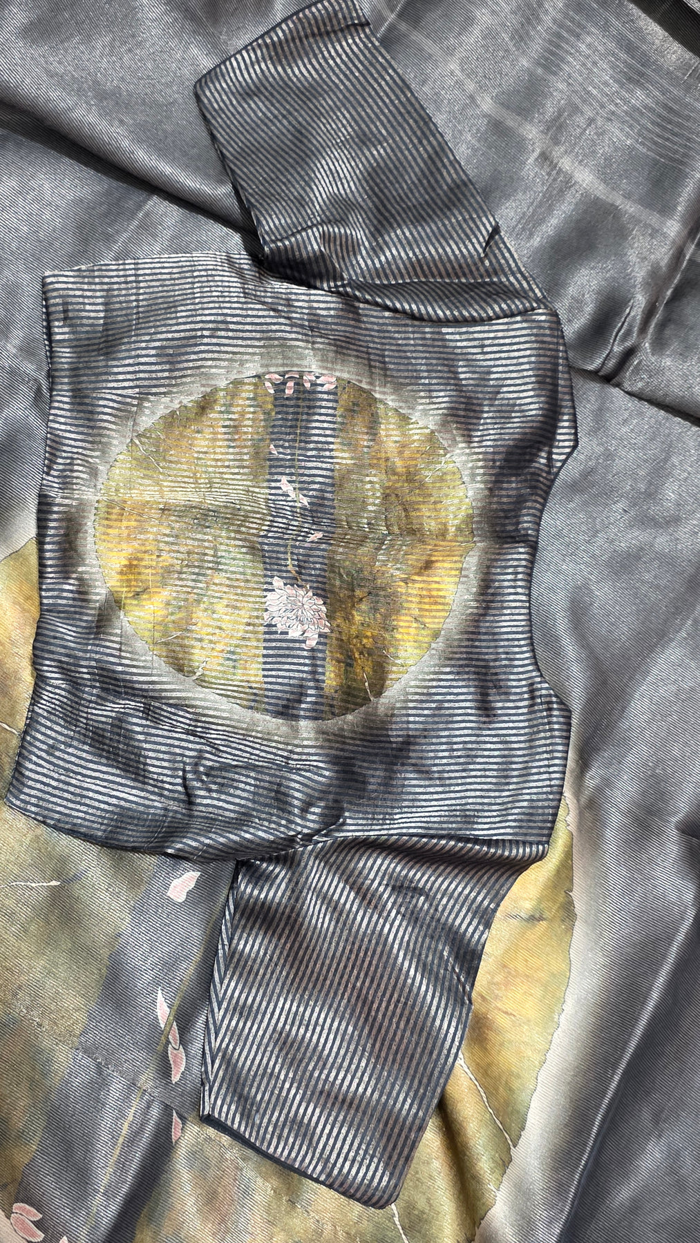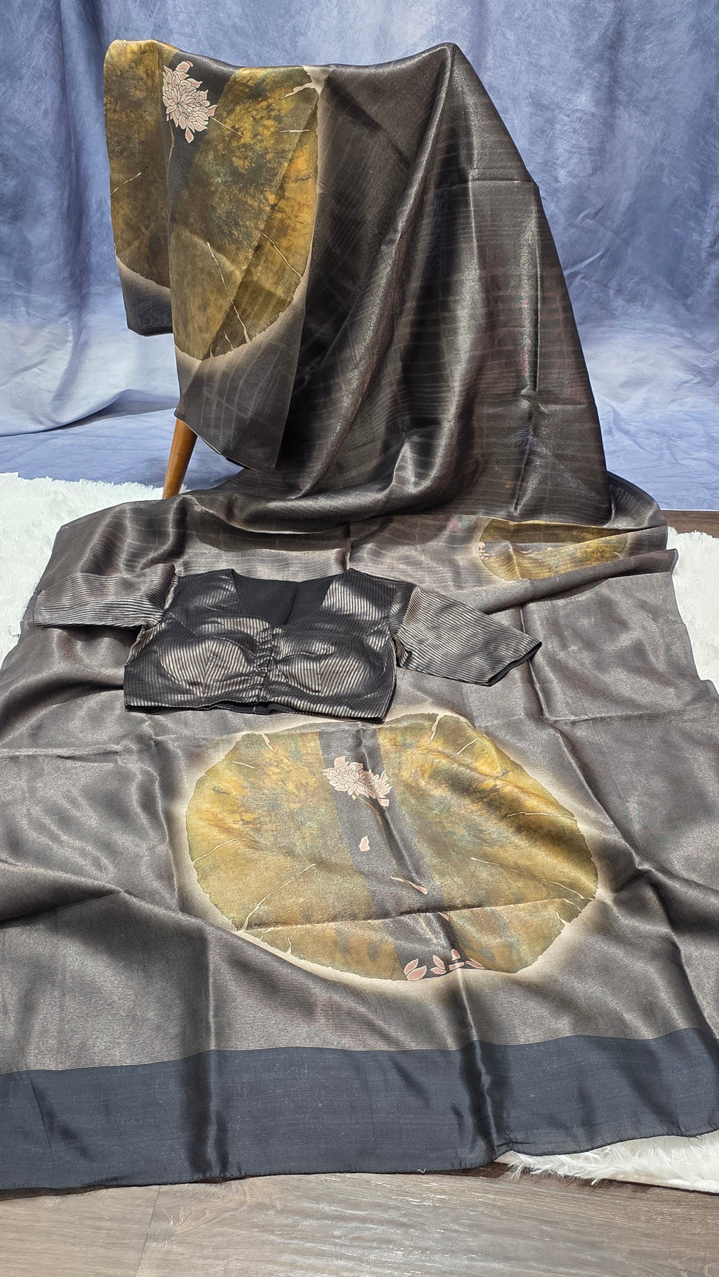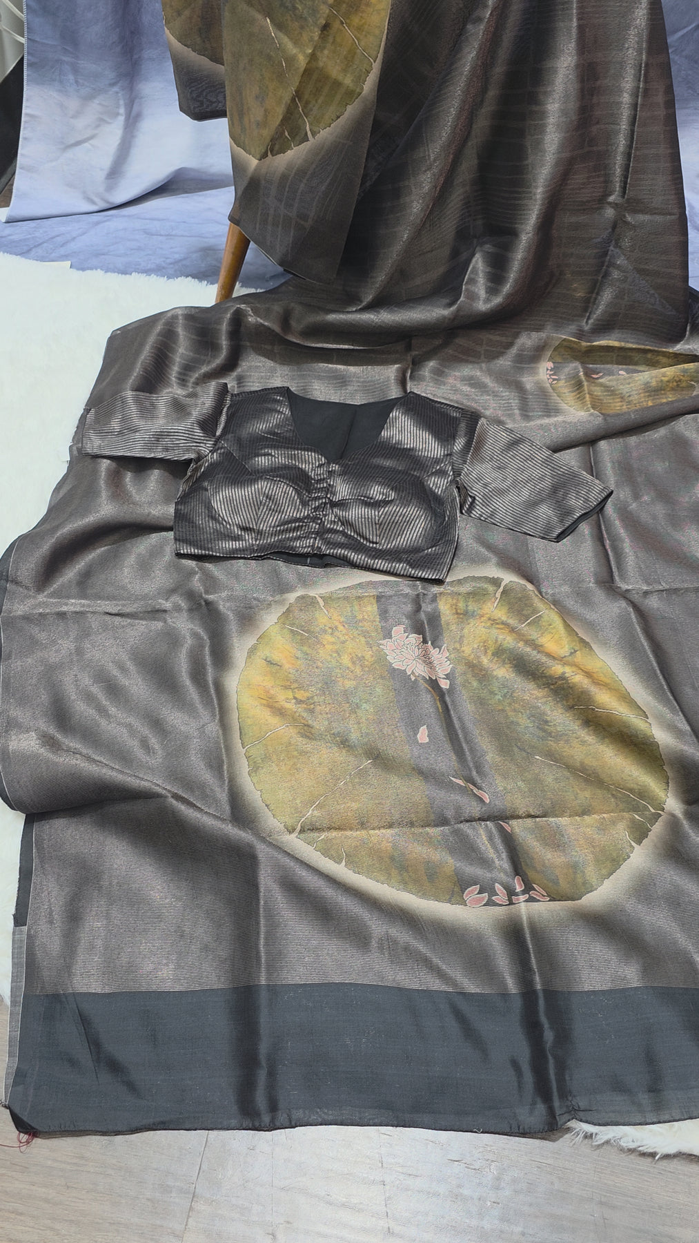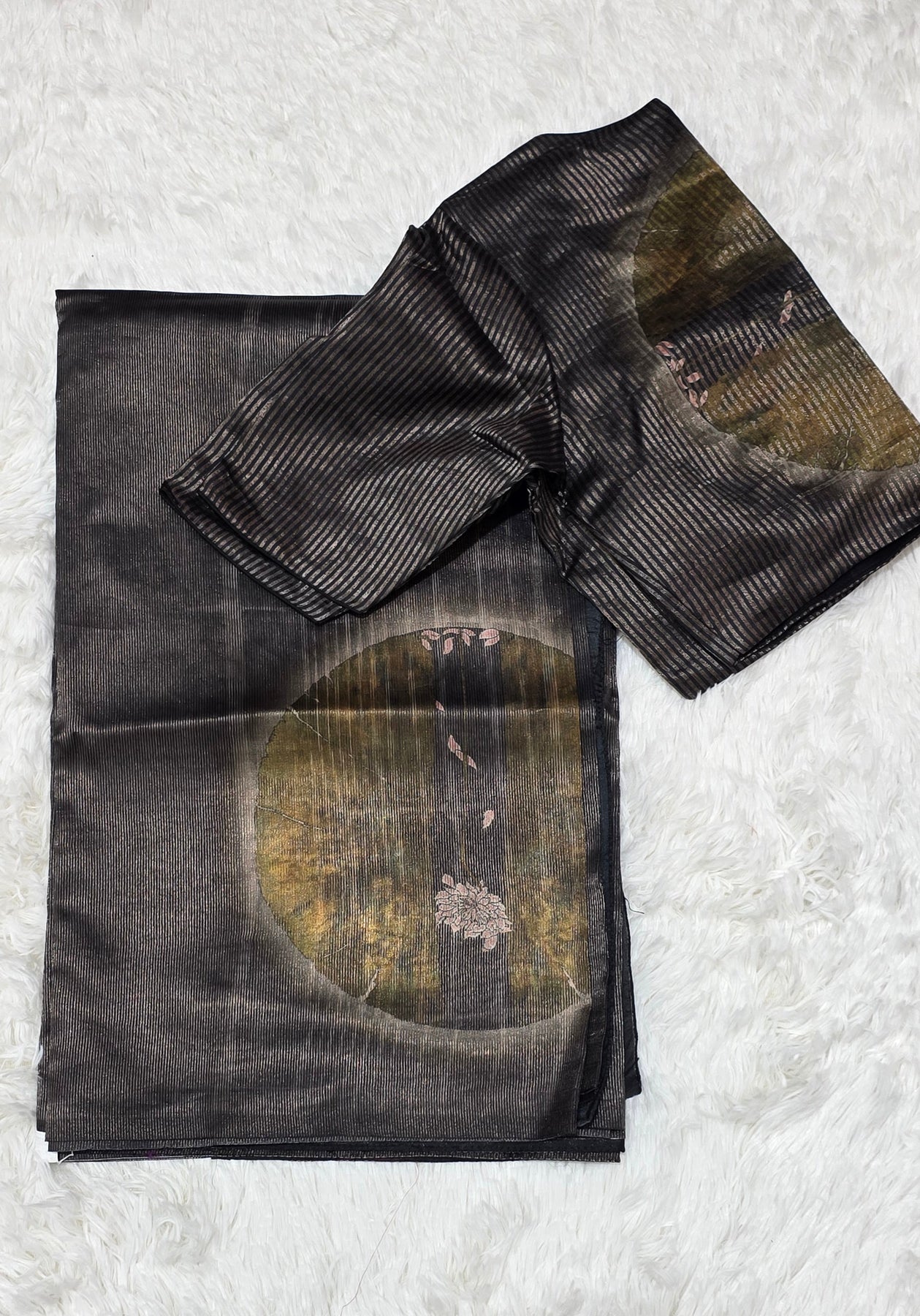 Elegant black silk chinia reshami zari saree featuring a stunning digital artistic motif—large abstract floral circle pattern in muted gold and olive tones, giving a contemporary luxury feel. Comes with a matching striped silk blouse with front gathers and a stylish round cut-out back. Perfect for evening events, receptions, or fashion-forward festive styling.