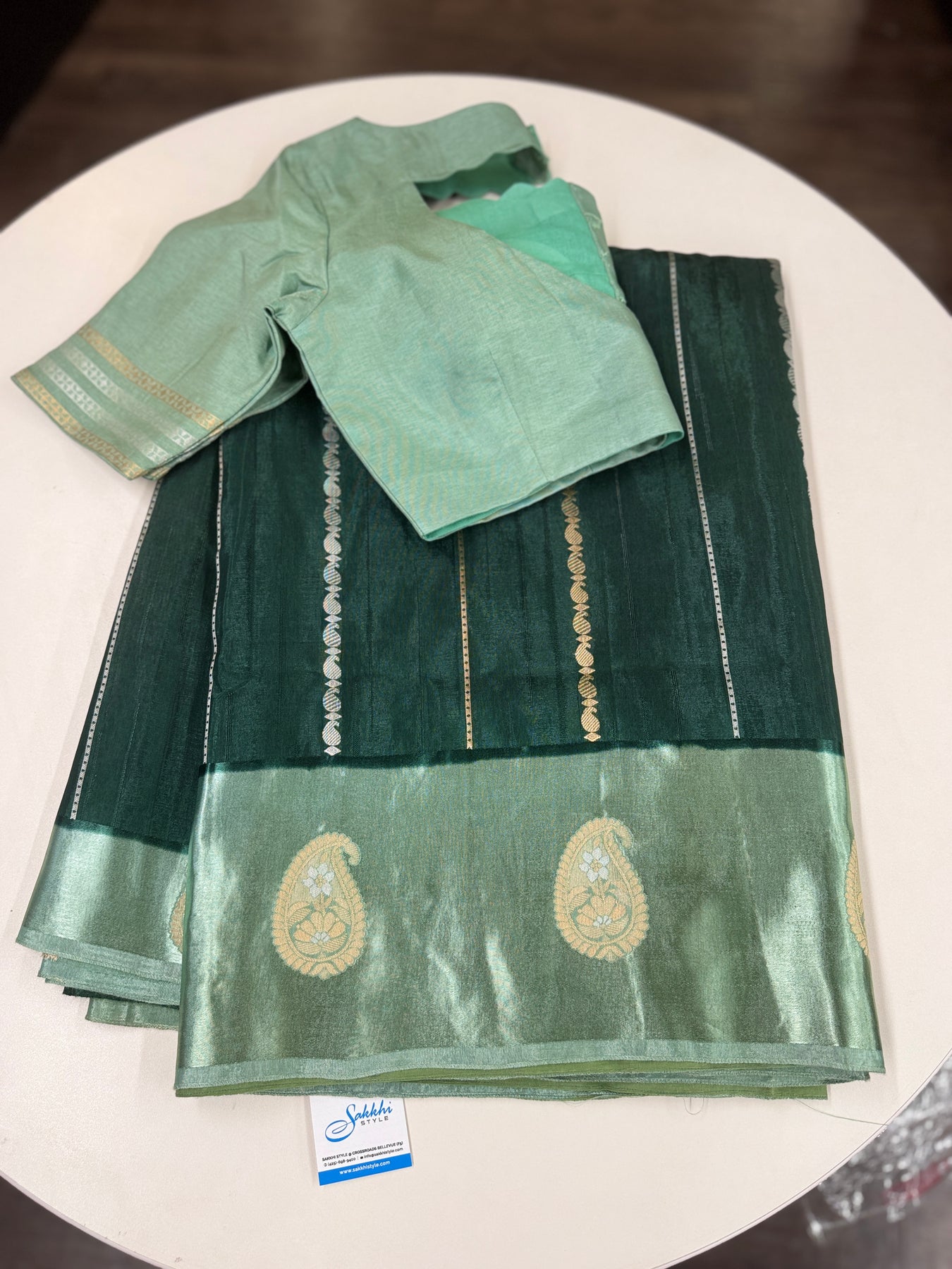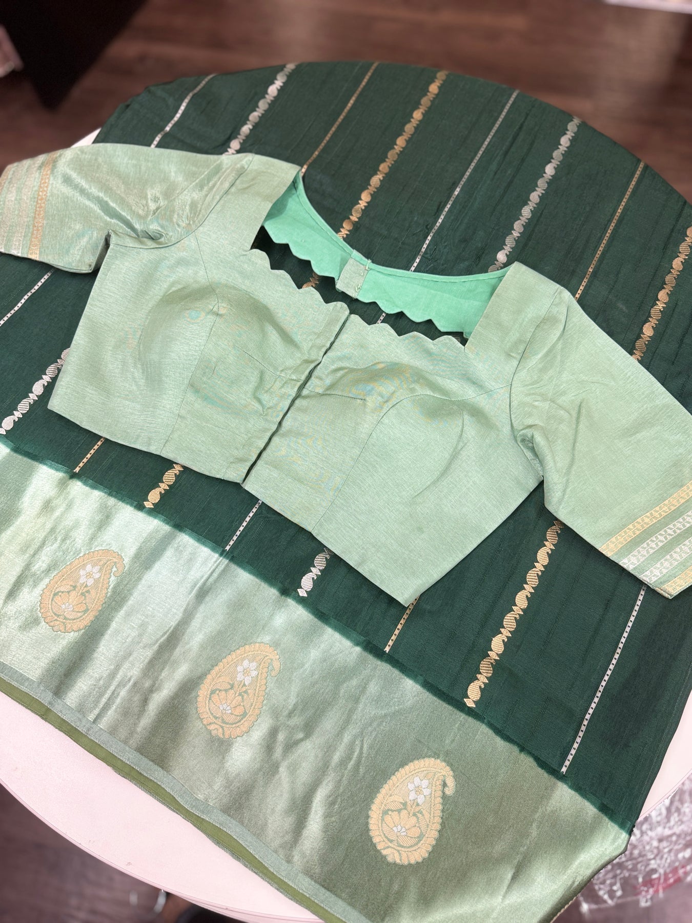 • Matching mint green blouse with zari-accented sleeves