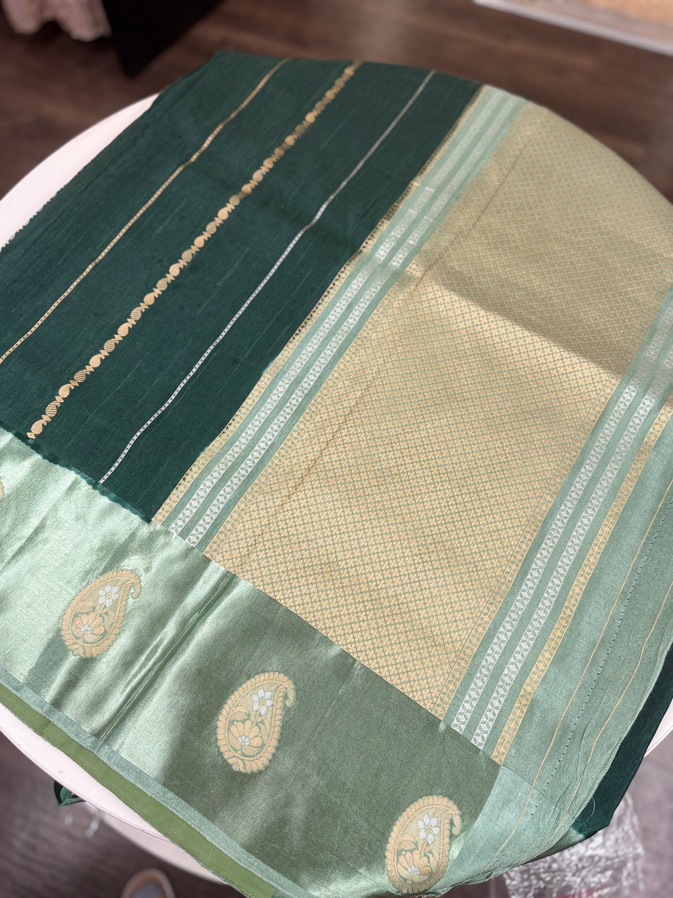 • Contrasting mint green border with traditional Banarasi paisley motifs