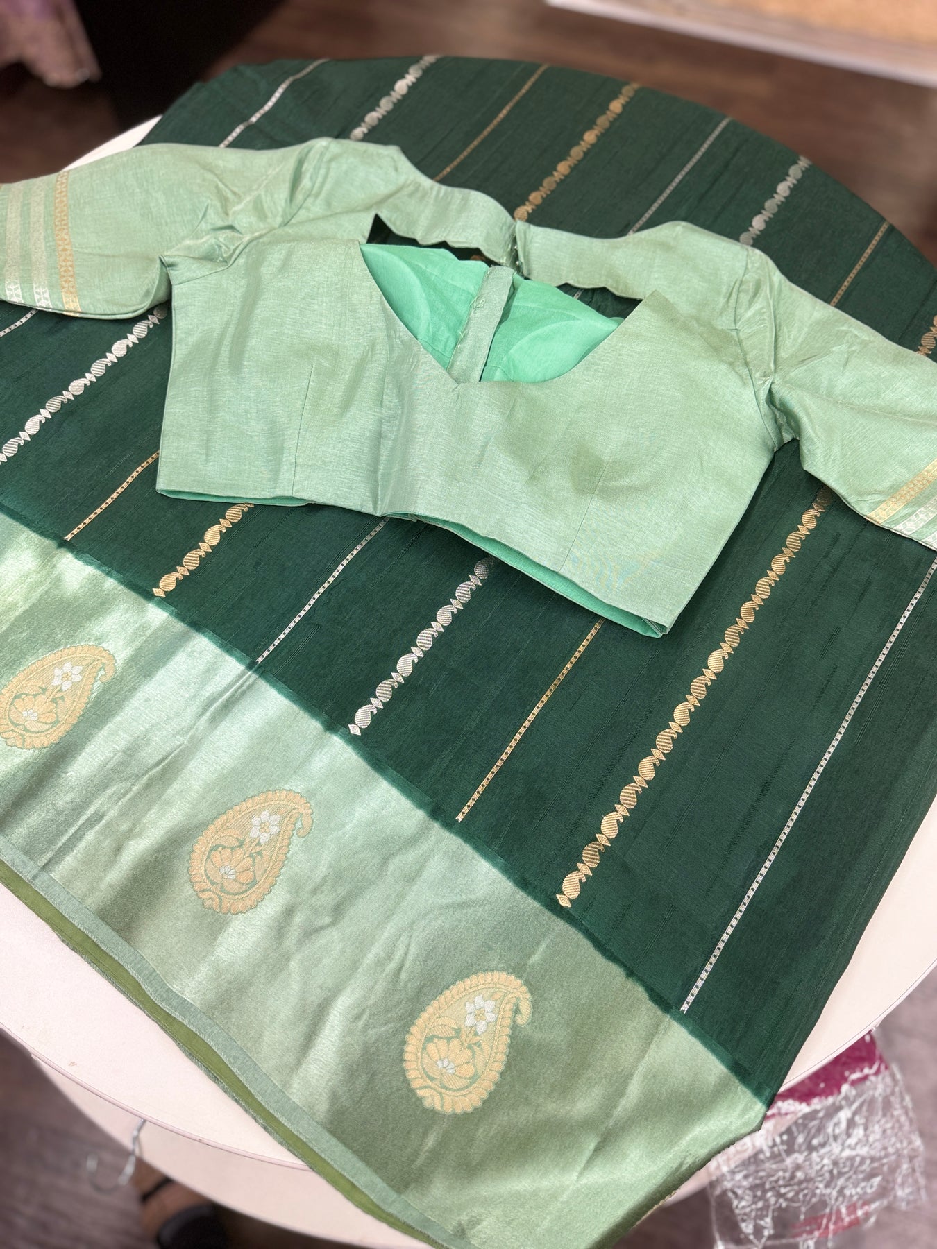The body features refined vertical zari stripe detailing that adds subtle shimmer and structure to the drape. The contrasting mint green border is enhanced with classic Banarasi paisley motifs woven in soft gold zari, lending the saree a timeless appeal. Paired with a matching mint green blouse featuring coordinated sleeve zari detailing, this ensemble offers a complete and polished look.