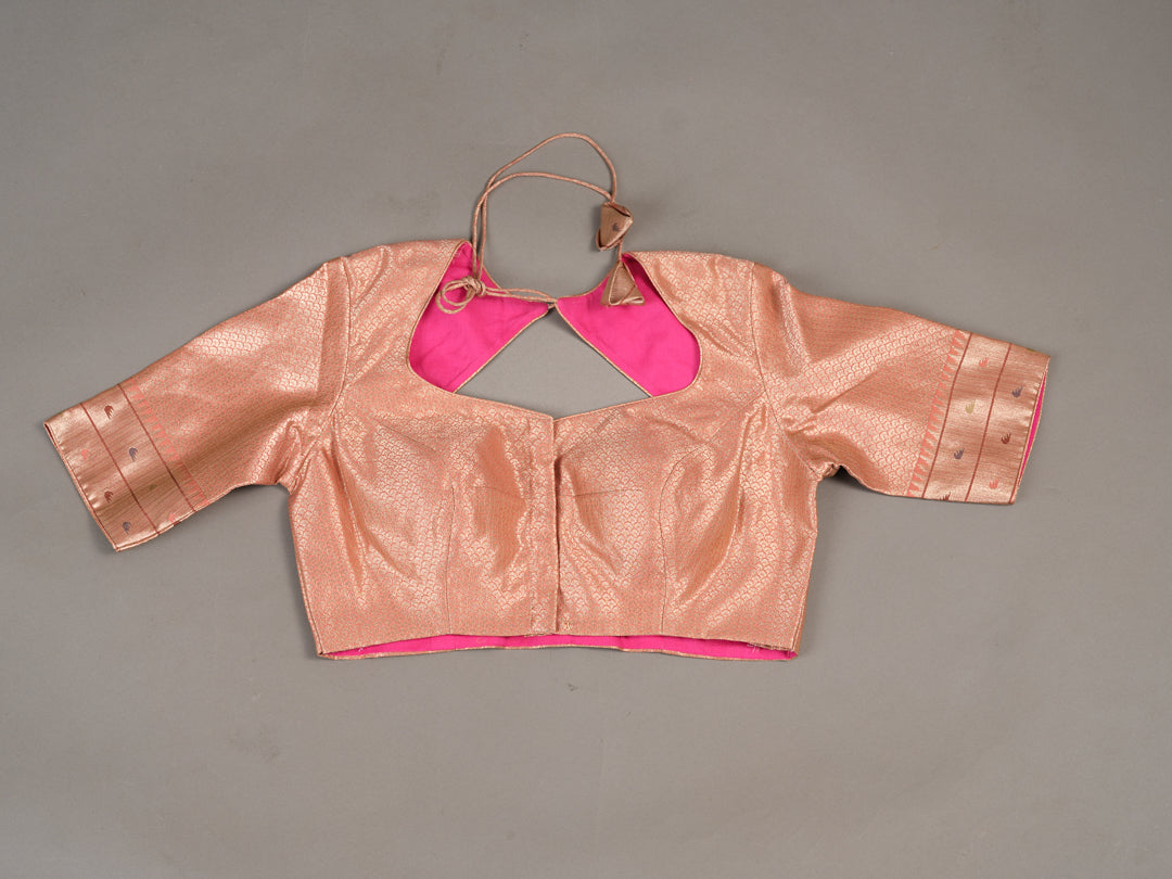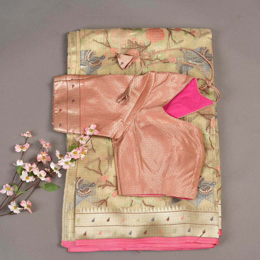 Soft as sunrise, the butter yellow saree unfurls, its tissue Kota fabric whispering sweet nothings. Delicate zari woven florals dance across the fabric, a garden of golden light. Paired with a blush peach blouse, the combination is ethereal - a gentle dawn mist. The yellow and peach hues blend in tender harmony, creating a canvas of soft romance. She who wears this saree is a vision of loveliness, her beauty and grace as delicate as a flower petal, her spirit as bright as the morning sun.