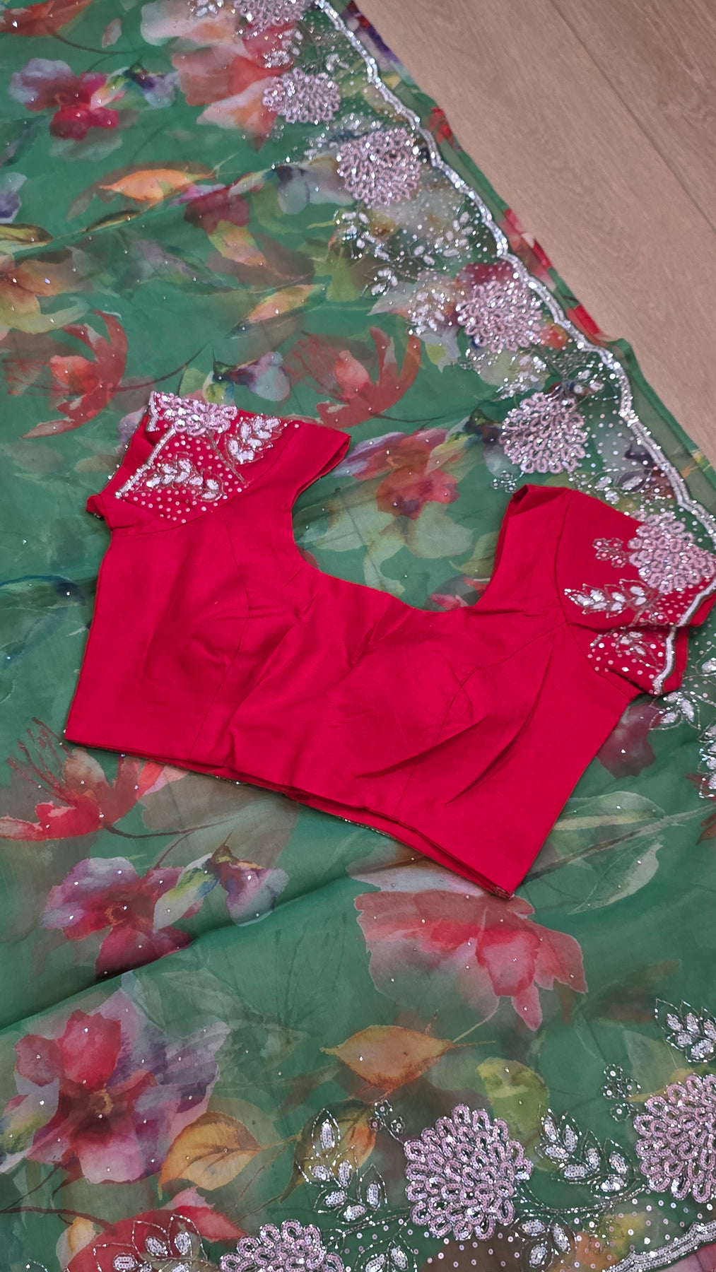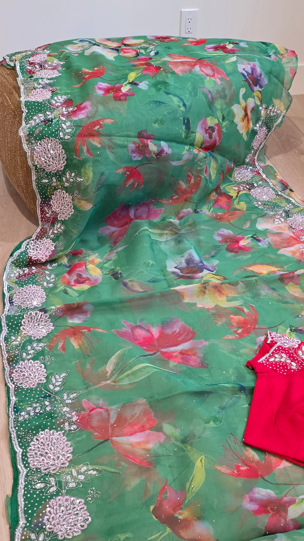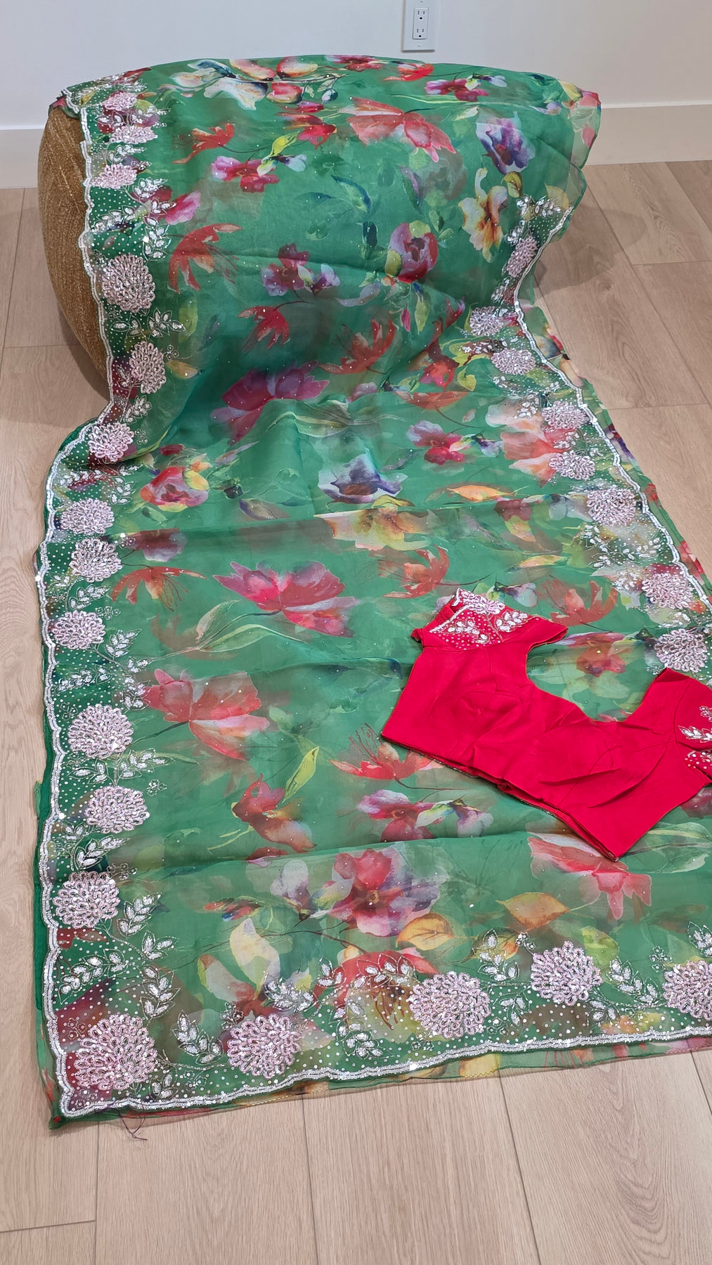 This saree features a beautiful watercolor-style floral print on lightweight organza fabric, enhanced with a heavily hand-embroidered border using sequins, beads, and fine threadwork. The subtle sparkle adds just the right amount of festive charm without overpowering the softness of the fabric.