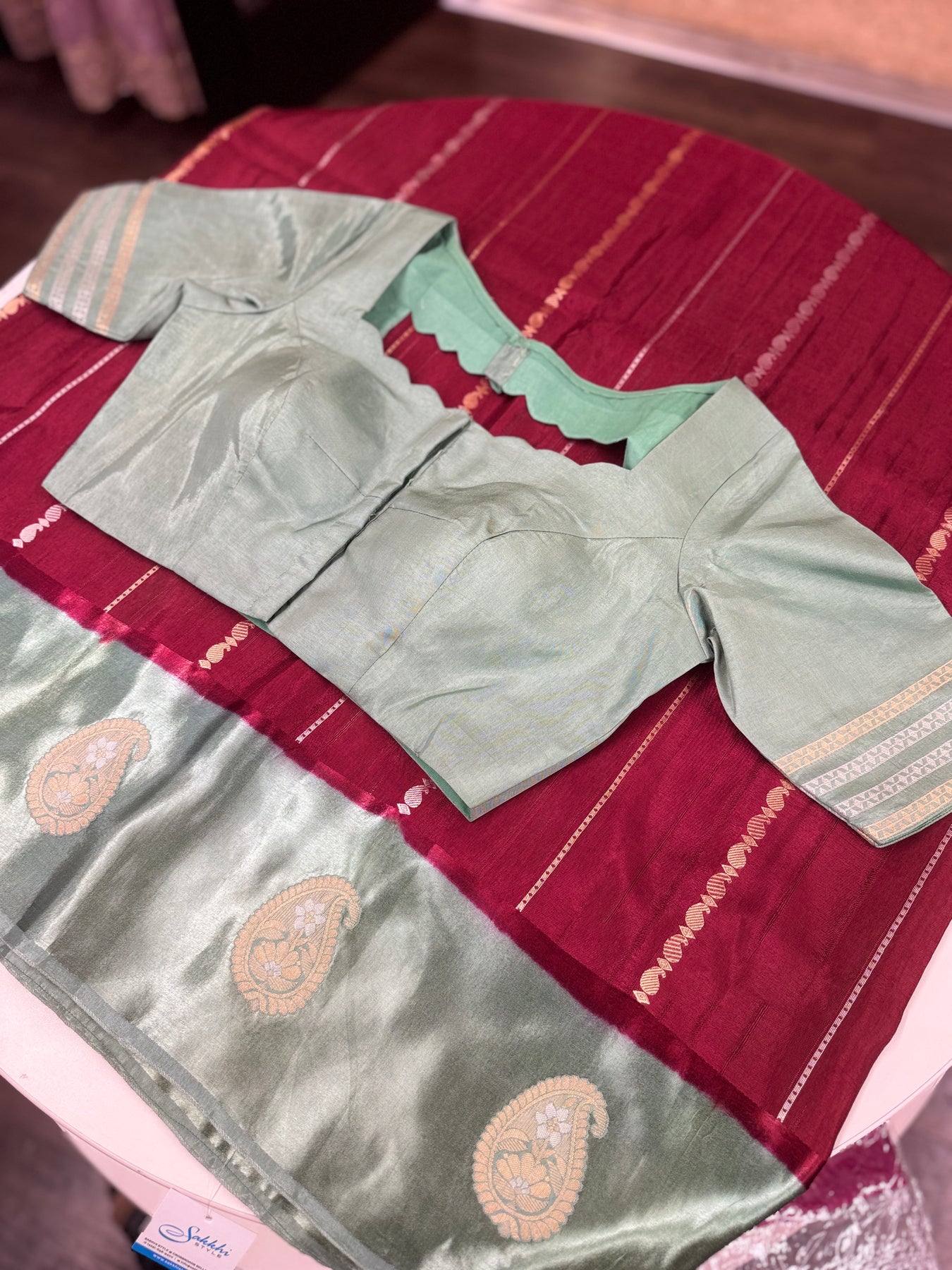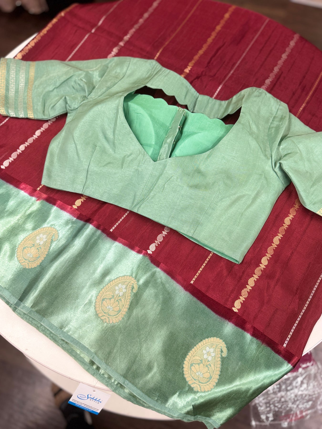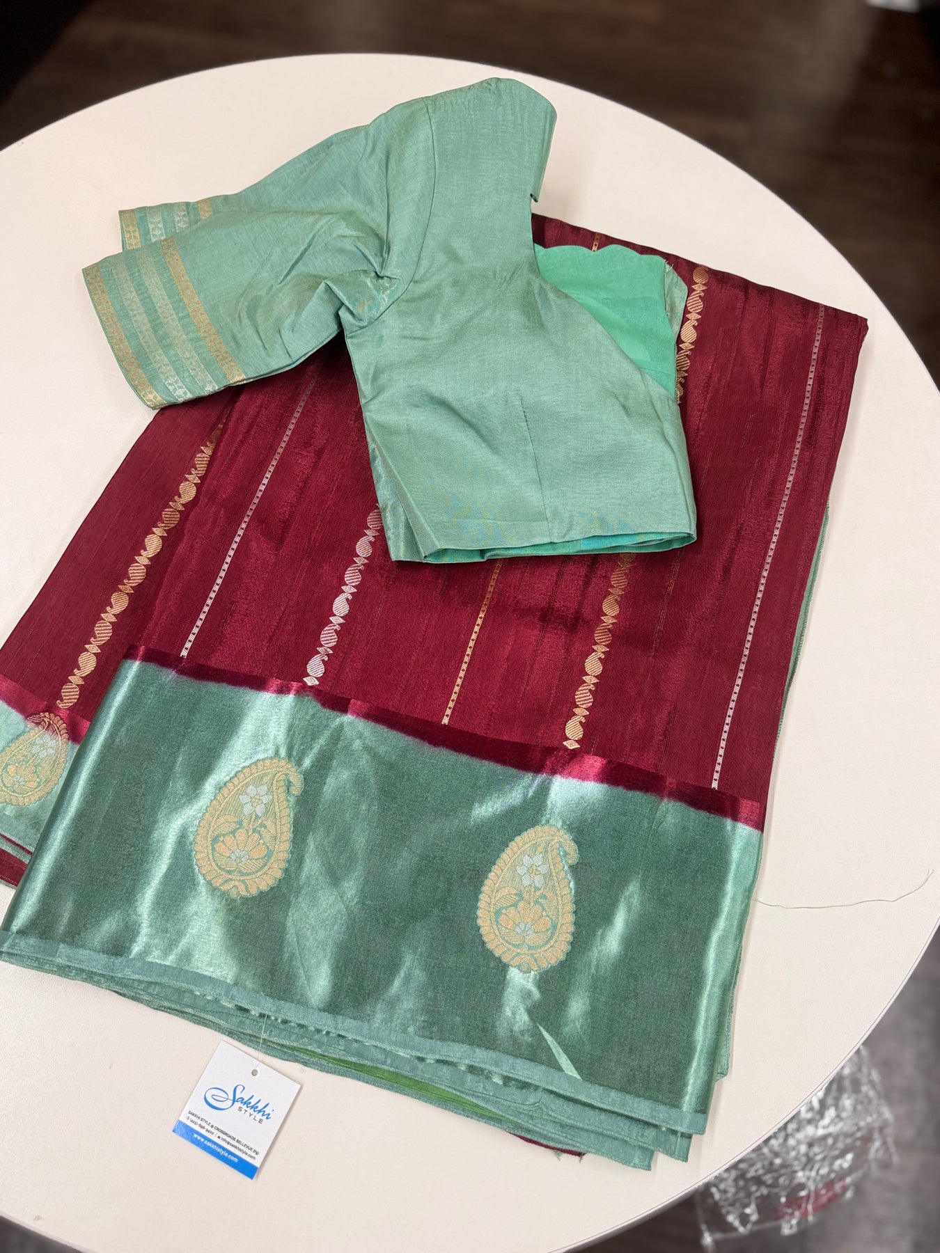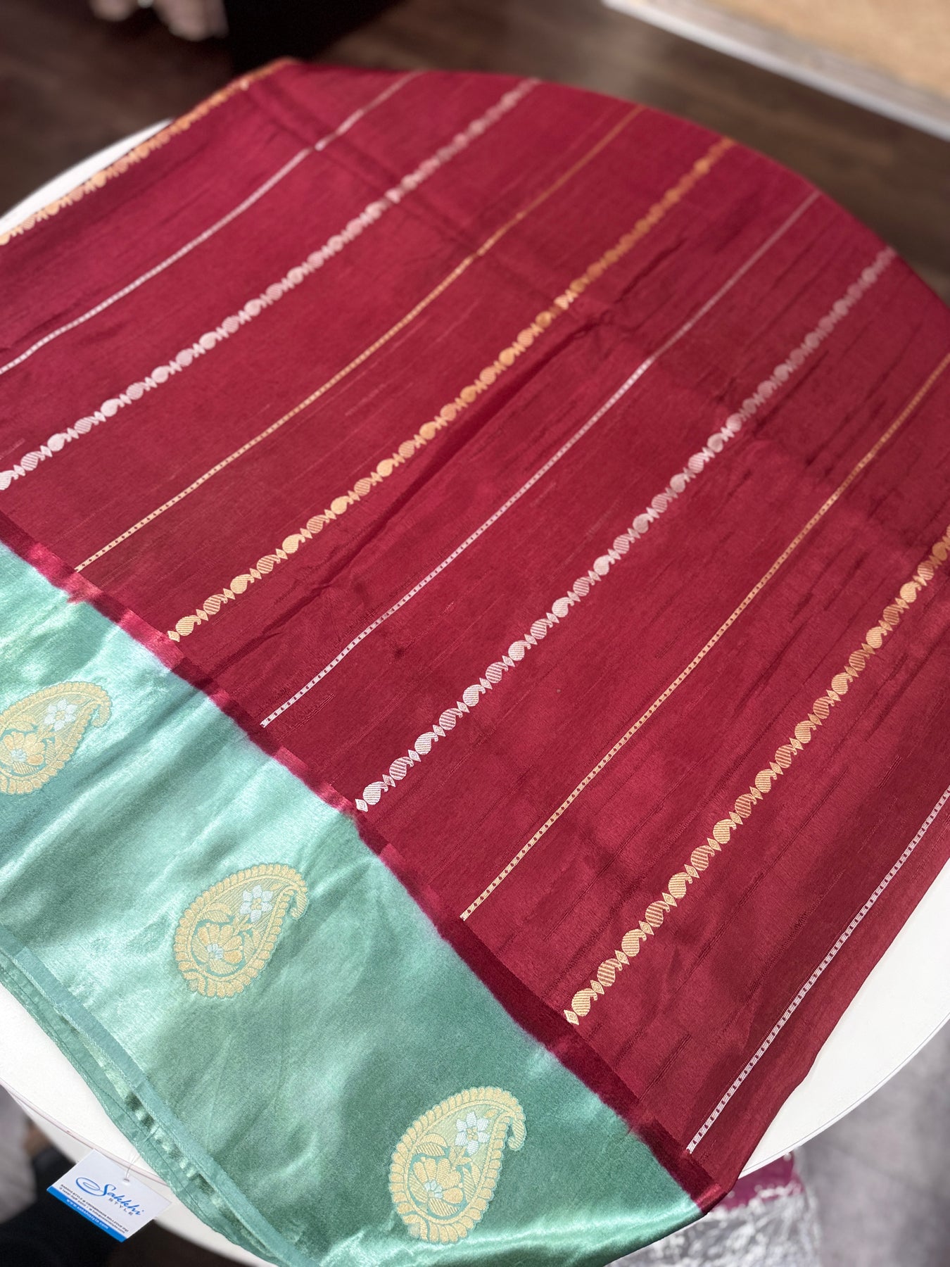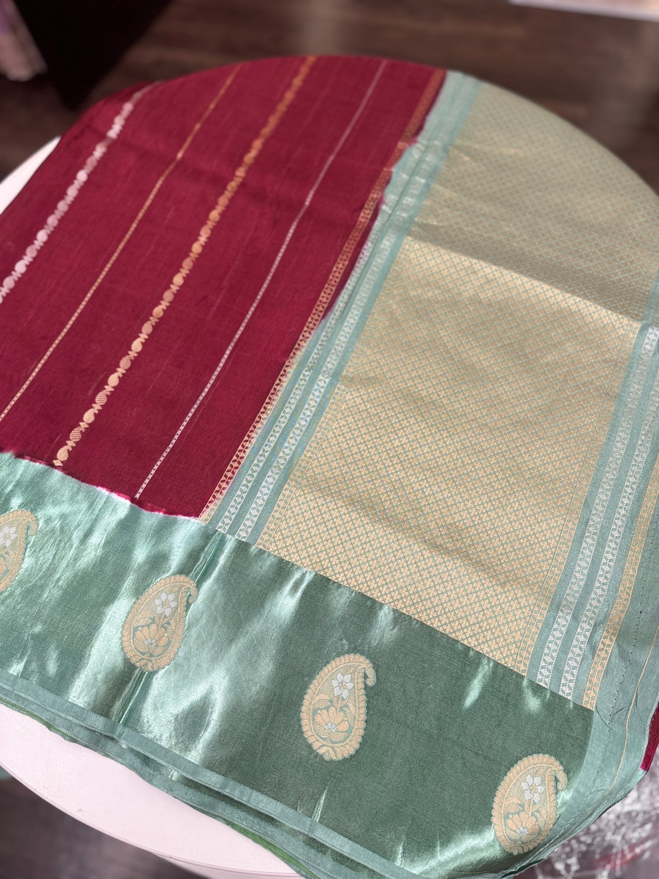The saree features fine vertical zari stripe detailing across the wine red body, adding a subtle shimmer and refined texture. The mint green border is enhanced with classic Banarasi paisley motifs woven in soft gold zari, lending a regal and traditional appeal. Completing the look is a matching mint green blouse, thoughtfully designed with zari-detailed sleeves for a coordinated and polished finish.