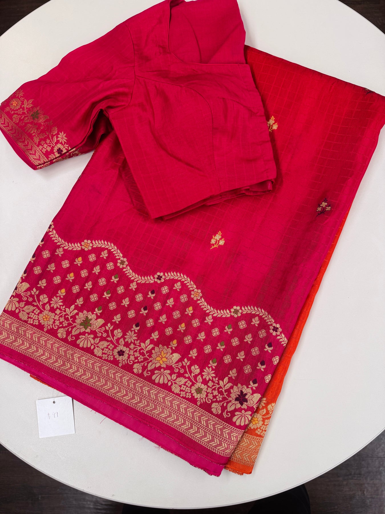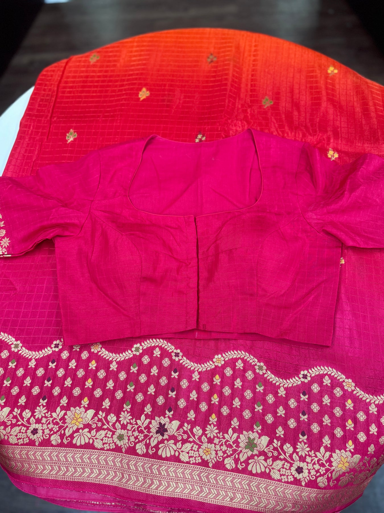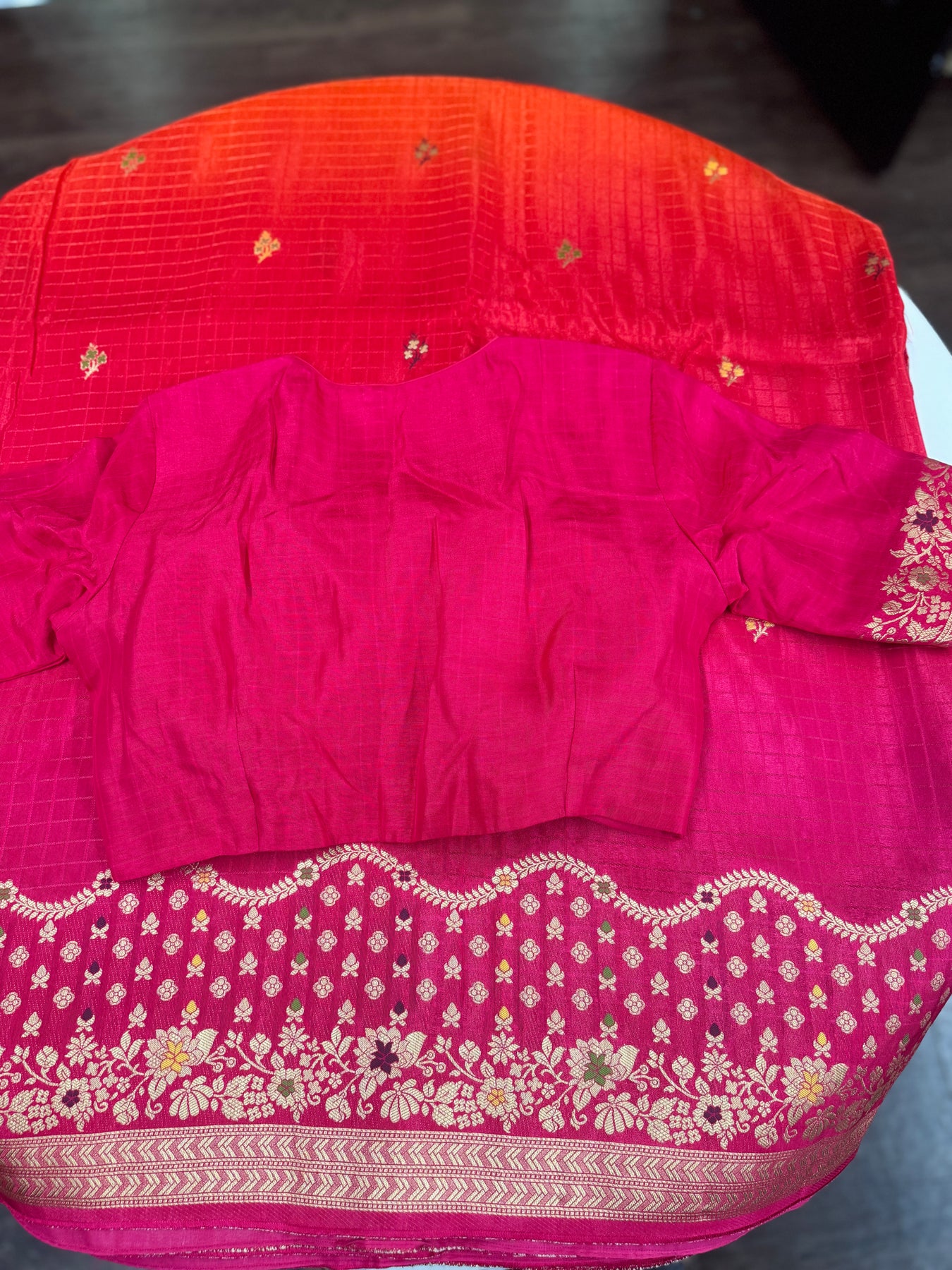 Make a graceful statement with this exquisite Banarasi Russian Silk Saree, crafted to celebrate timeless elegance and traditional artistry. The saree features a stunning pink-to-orange ombré tone, creating a vibrant yet refined look that stands out effortlessly.