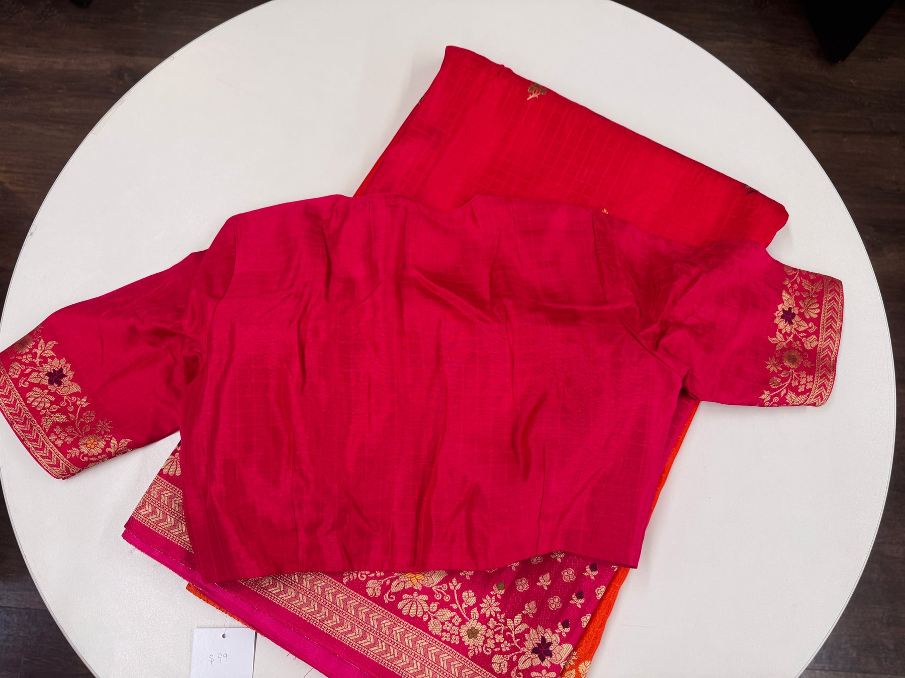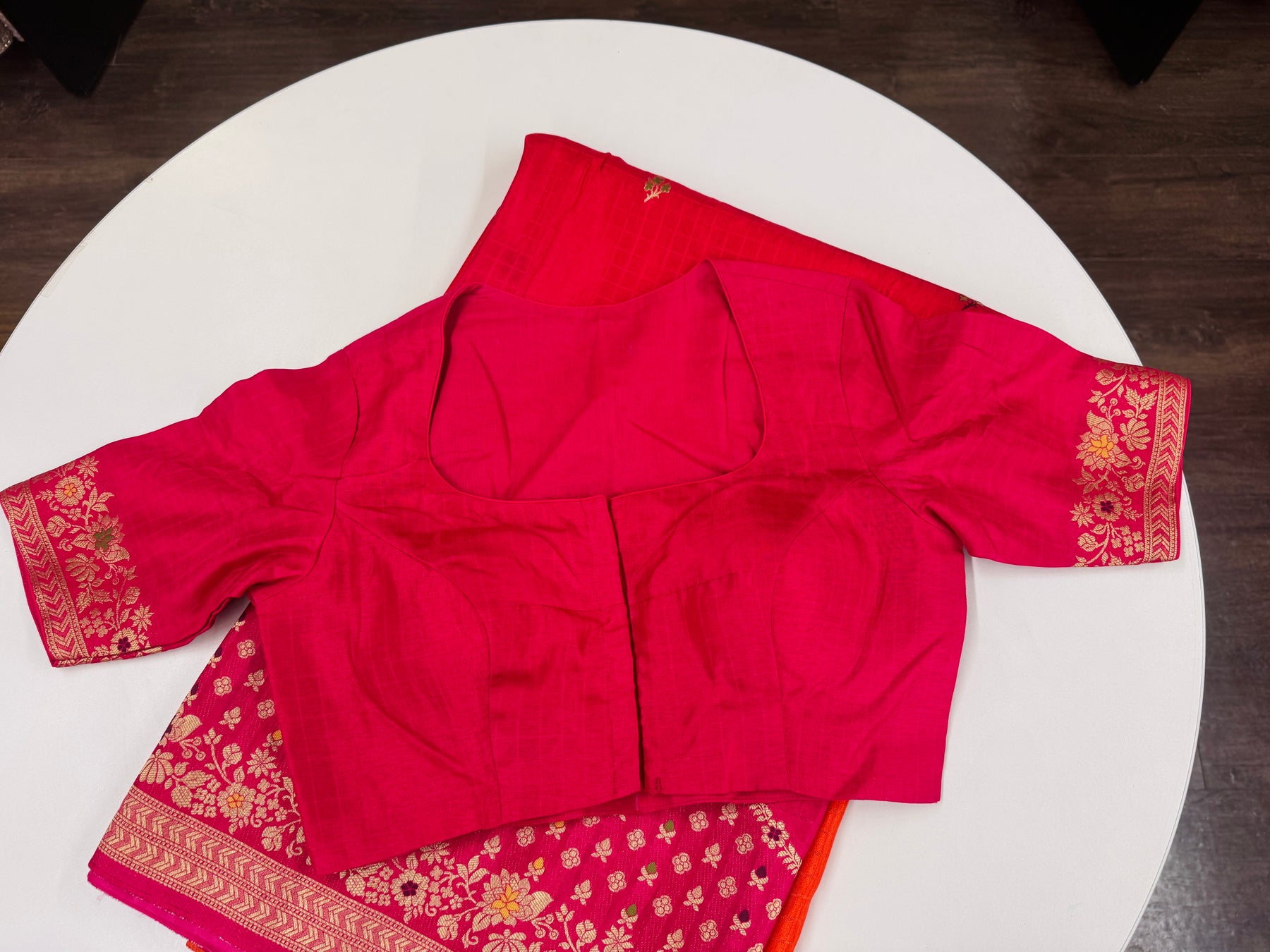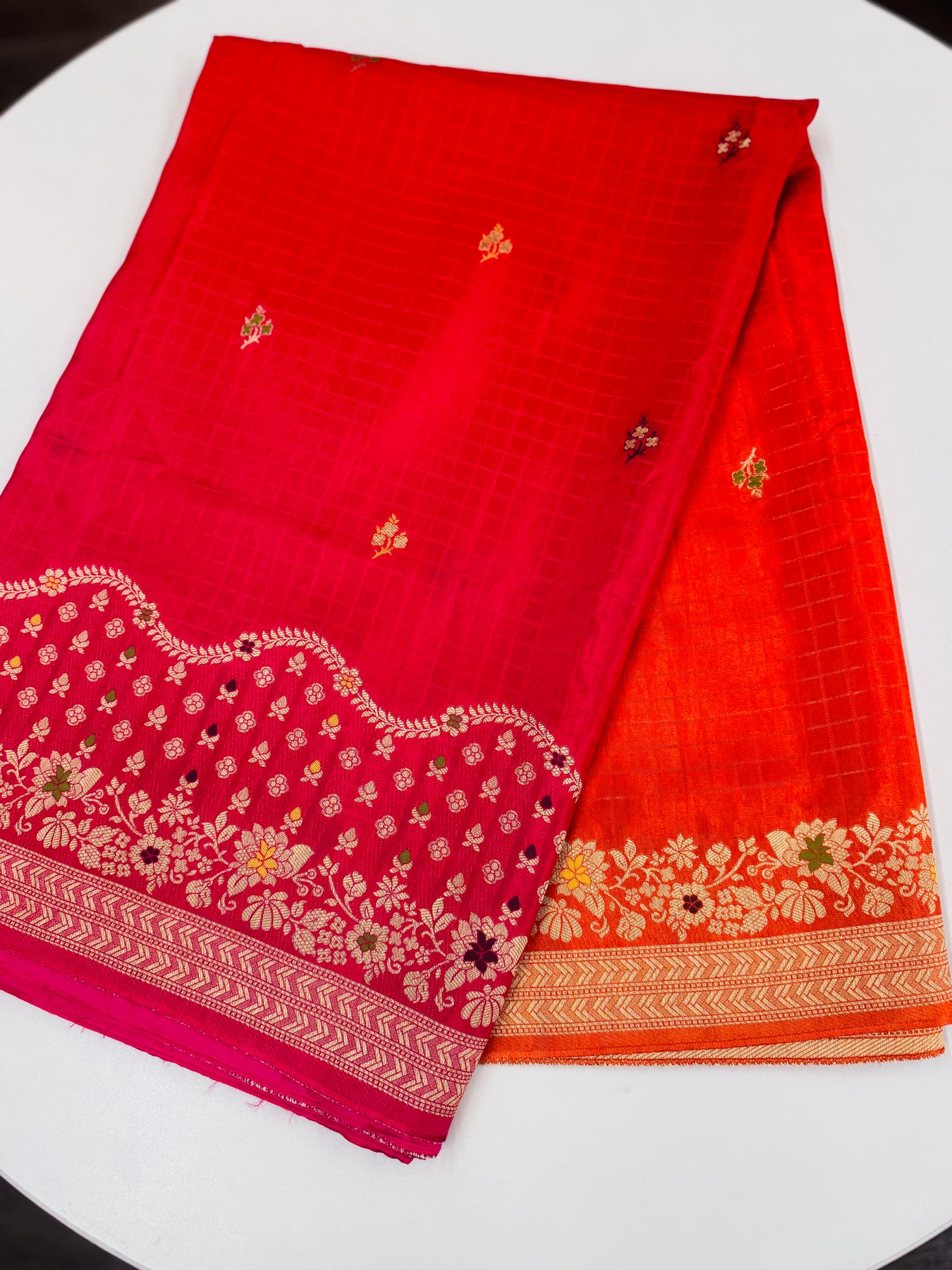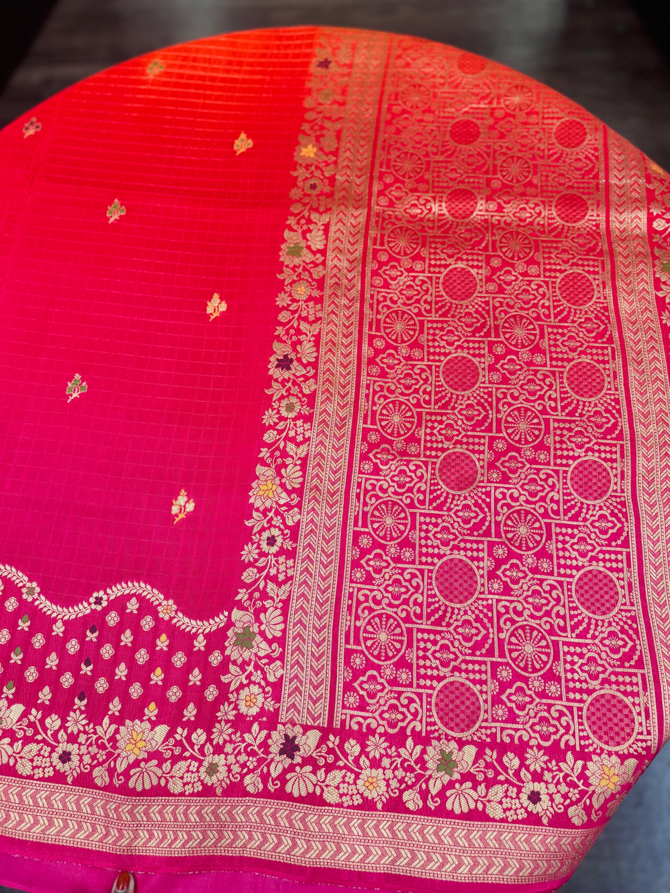 Make a graceful statement with this exquisite Banarasi Russian Silk Saree, crafted to celebrate timeless elegance and traditional artistry. The saree features a stunning pink-to-orange ombré tone, creating a vibrant yet refined look that stands out effortlessly.