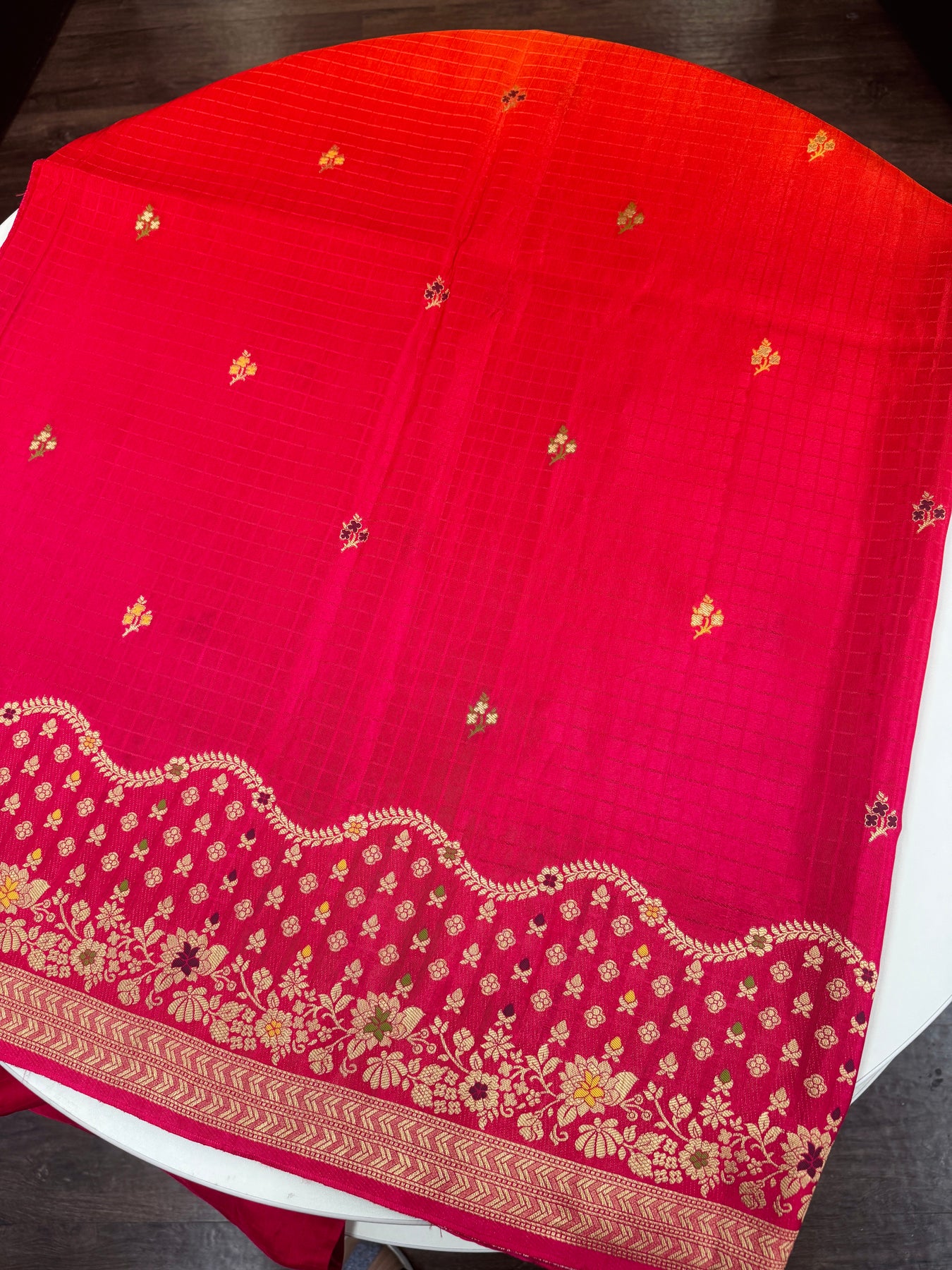 The body is adorned with delicate gold zari buttis woven over a subtle checked silk texture, adding depth and richness without overwhelming the design. The highlight of this saree is its elaborately woven Banarasi border, showcasing intricate floral jaal and geometric patterns in shimmering gold zari that reflect classic Banaras craftsmanship.
