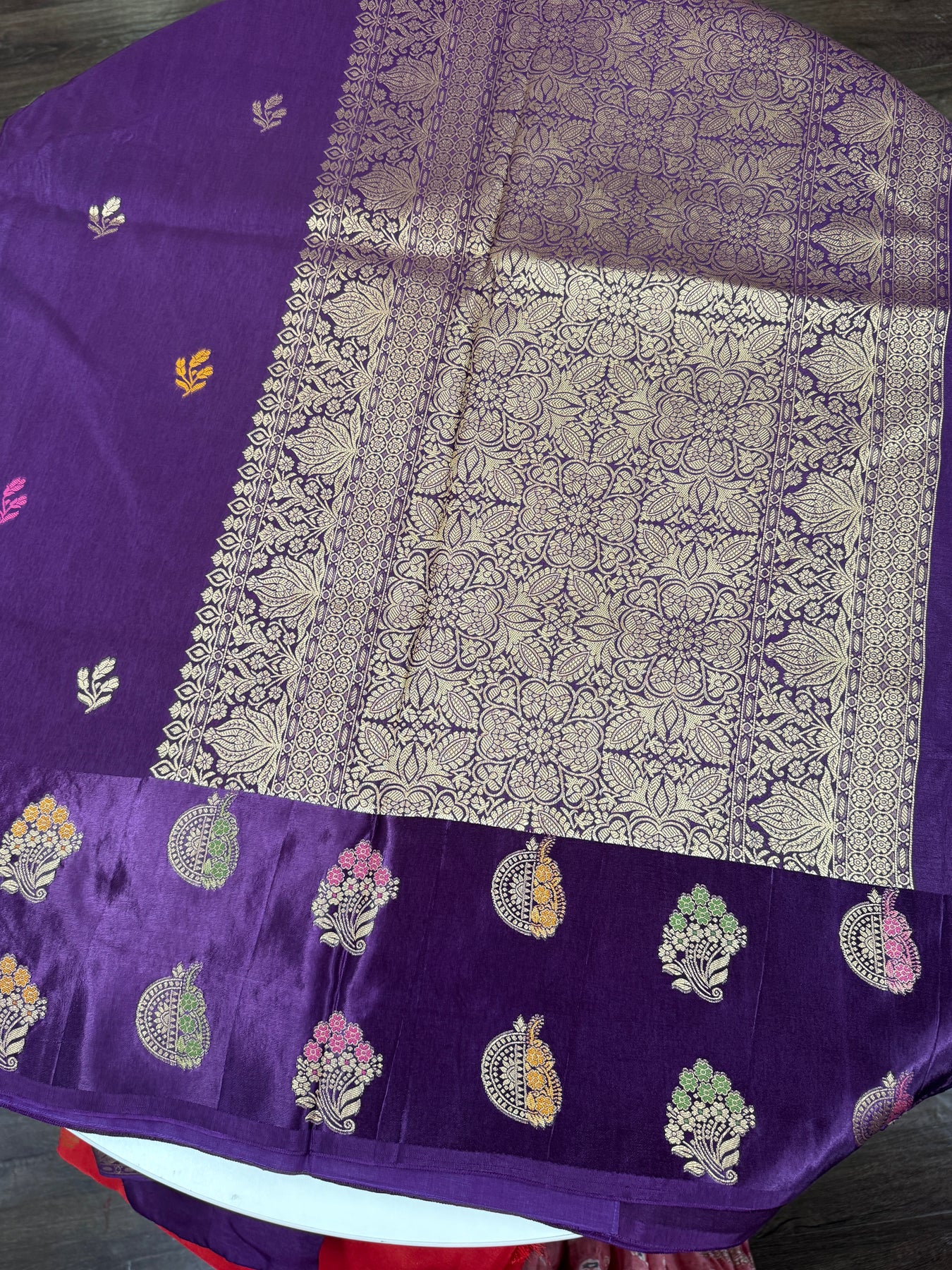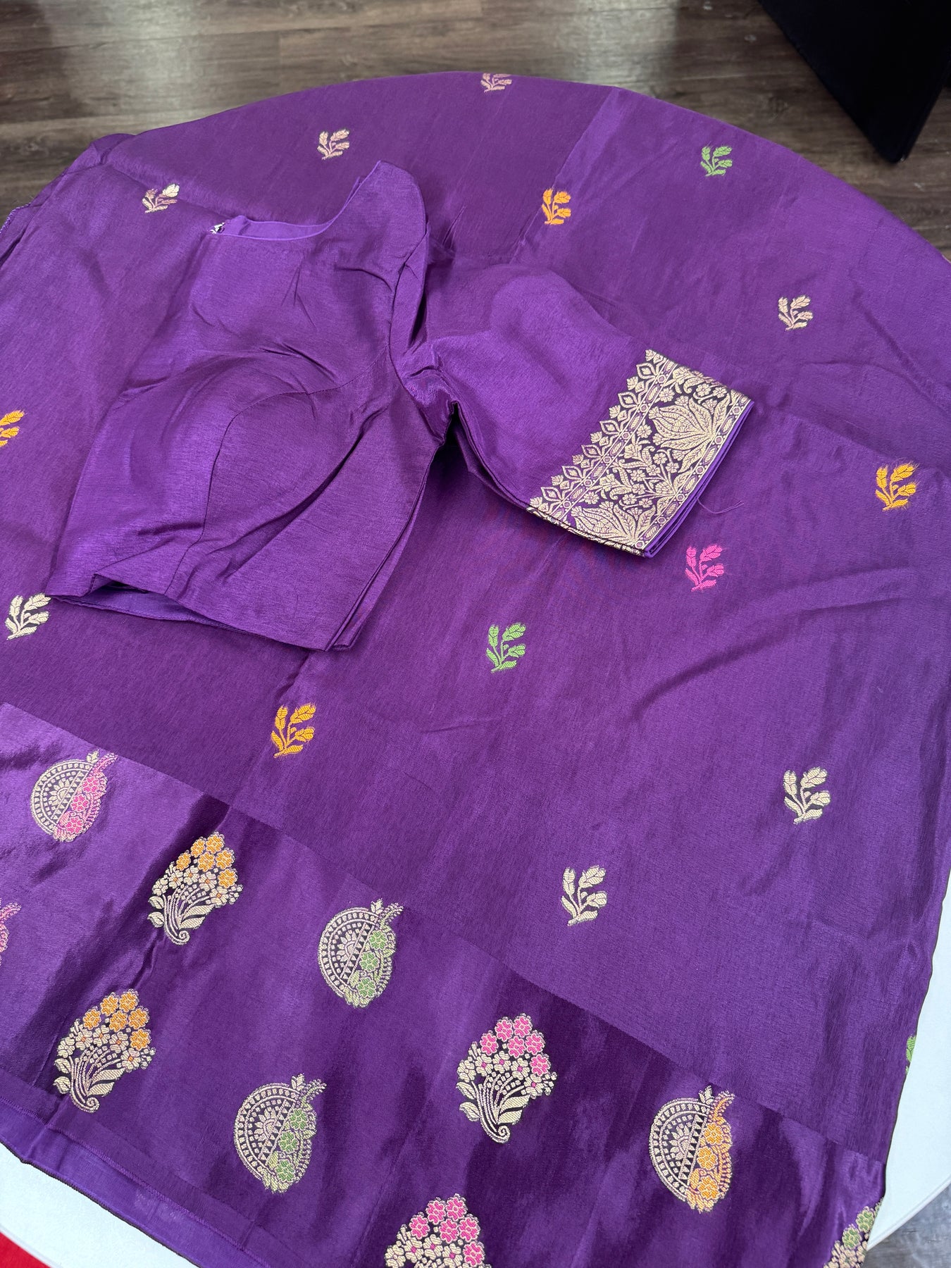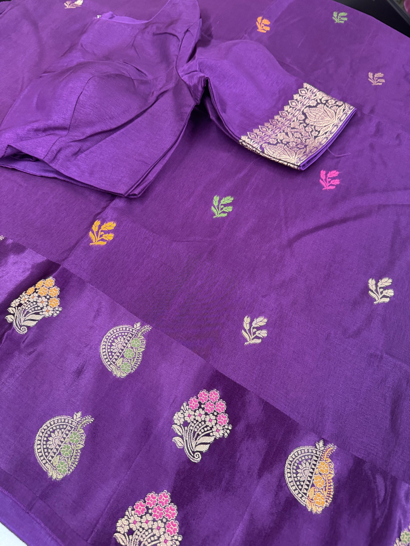 The saree features a deep royal purple silk body adorned with delicate multicolour woven butti motifs, adding subtle vibrance and charm. The standout element is the grand antique gold zari pallu, intricately woven with dense floral and vine patterns, giving the saree a luxurious, Banarasi-inspired finish. The lower border showcases traditional zari motifs, beautifully complementing the rich body color.