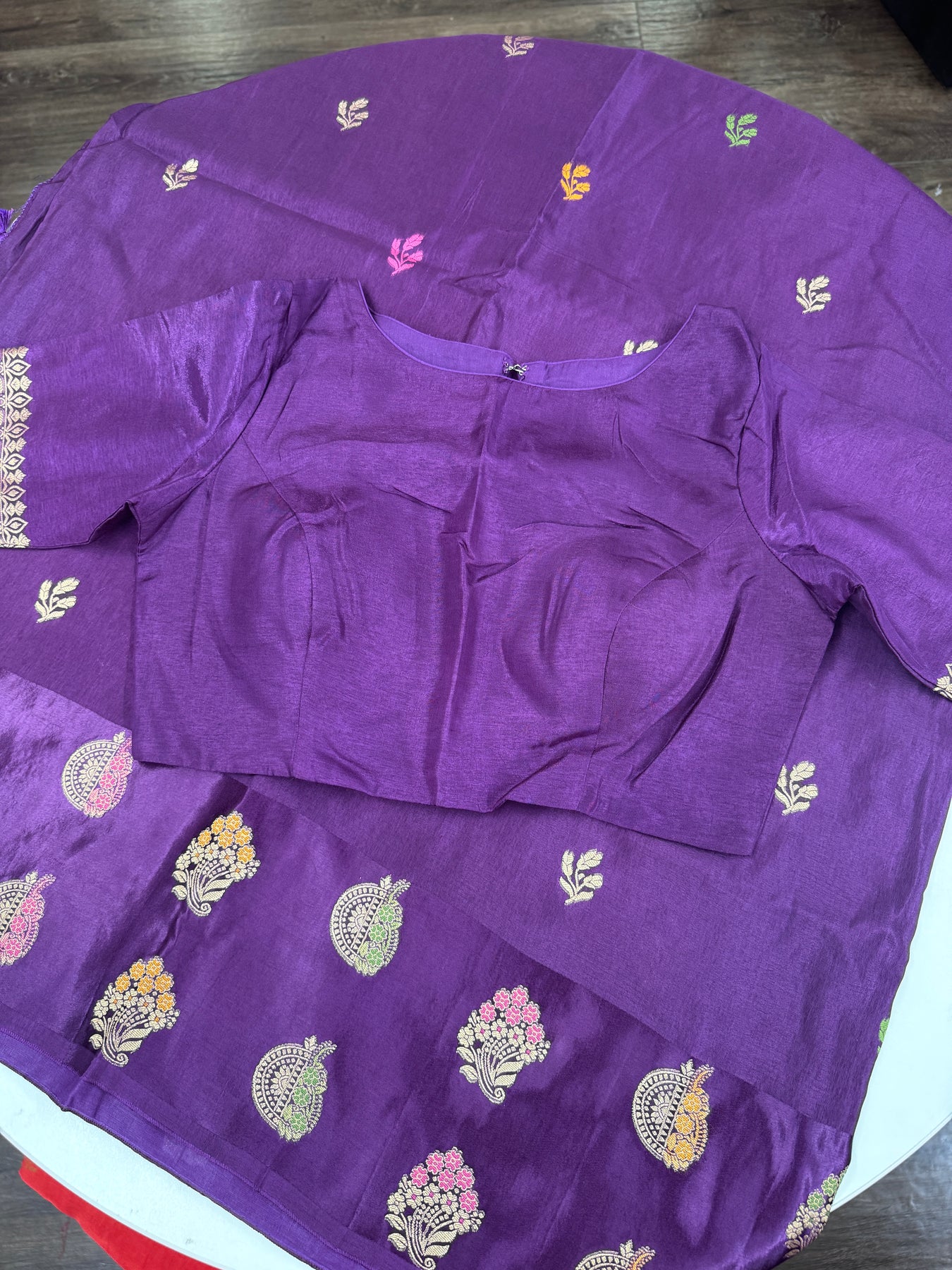 Paired with the saree is a matching royal purple blouse, thoughtfully tailored for elegance and comfort. The blouse comes with stylish elbow-length sleeves highlighted with zari-woven detailing at the sleeve borders, along with a structured fit and classic neckline for a refined traditional look.