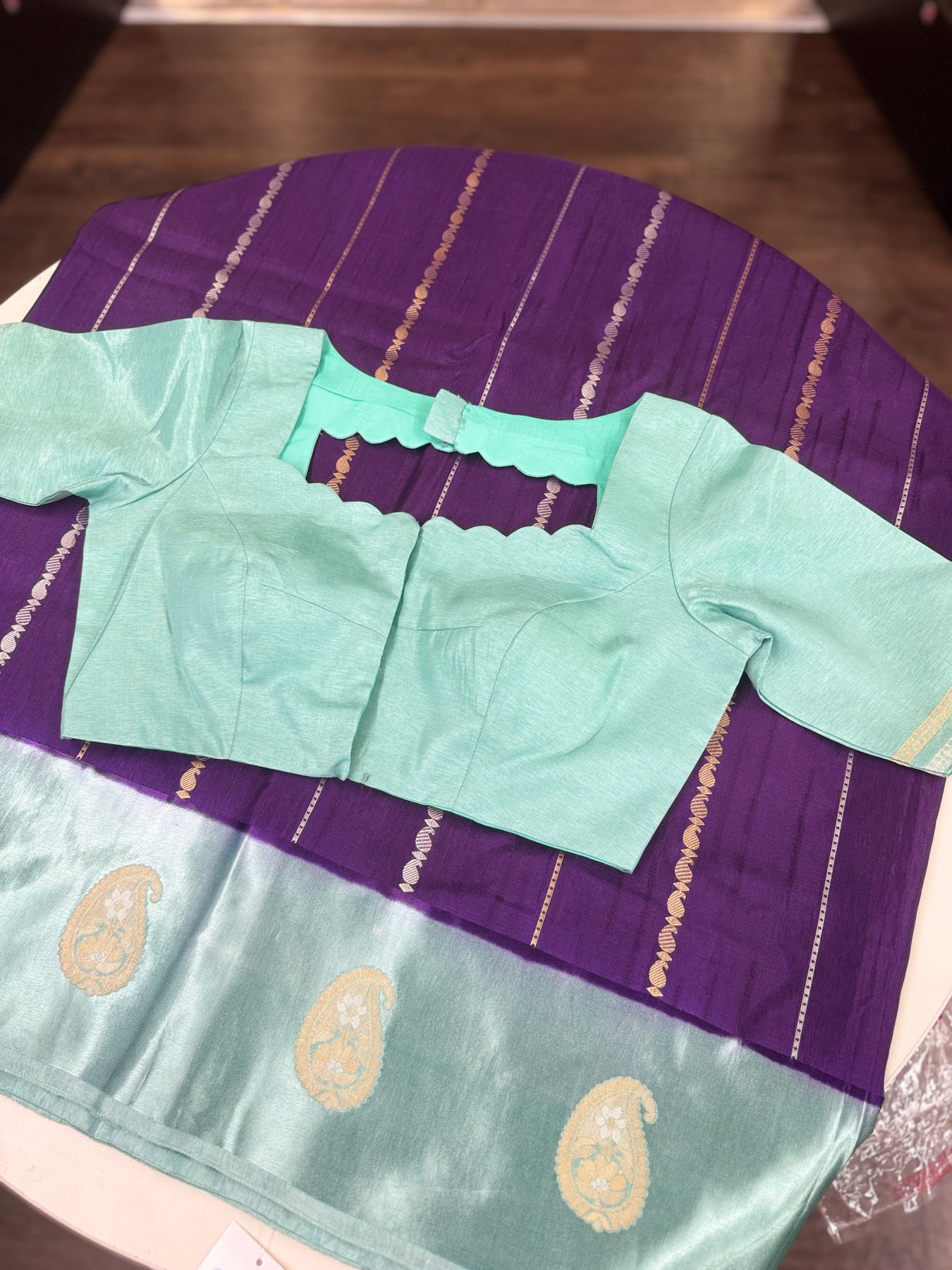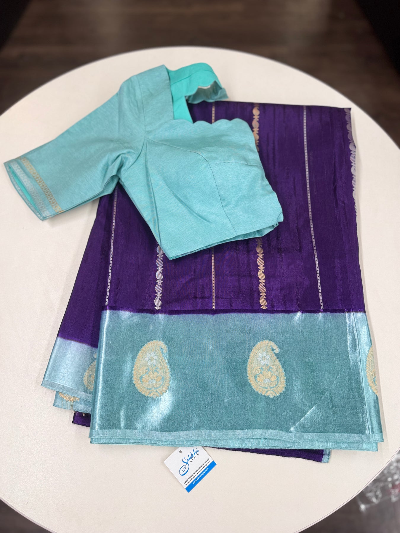 • Matching aqua blue blouse with zari-accented sleeves