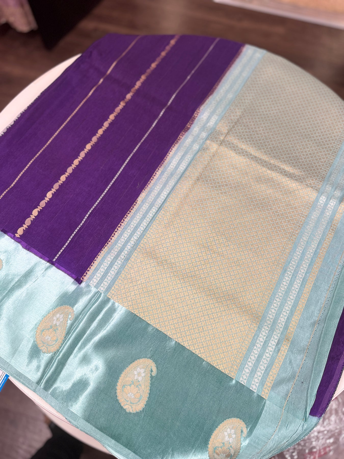 • Contrasting aqua blue border with classic Banarasi paisley motifs
