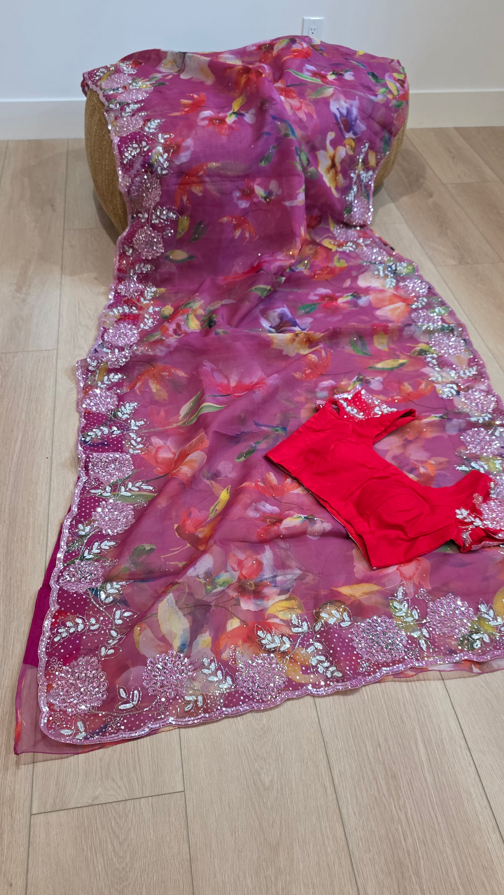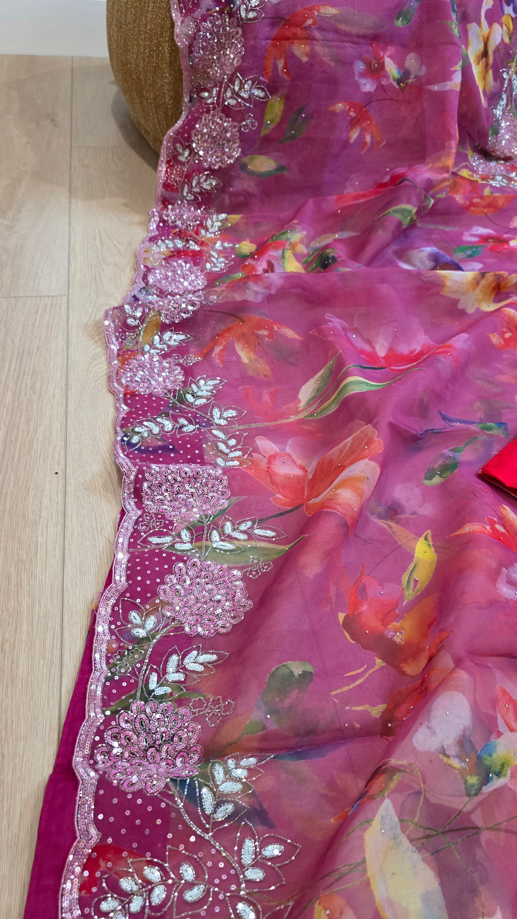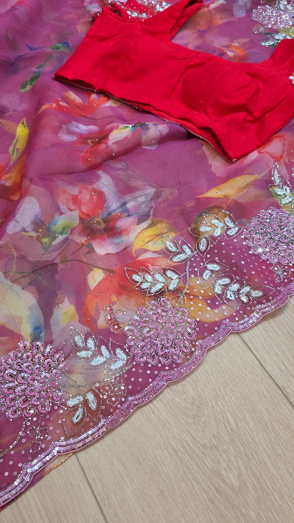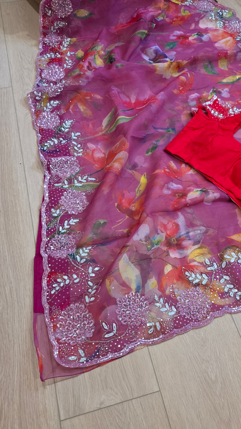 Crafted in premium organza fabric, this saree showcases a delicate watercolor floral print enhanced by a heavy fancy border adorned with hand embroidery, sequins, and fine detailing. The soft shimmer along the border adds elegance while maintaining a lightweight and airy drape.