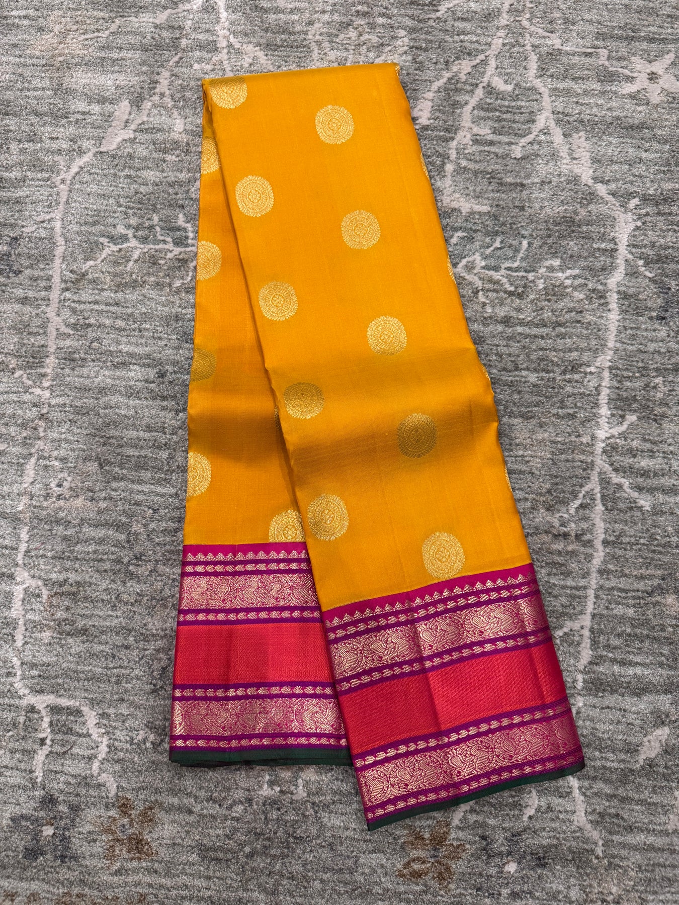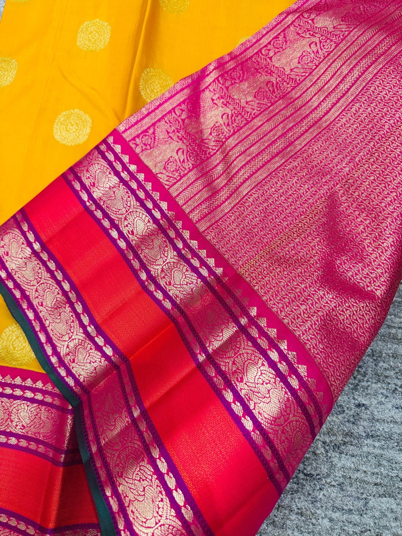Celebrate timeless South Indian elegance with this exquisite Kanchivaram silk saree crafted in a rich mustard yellow body paired with a striking rani pink border and pallu. The body is adorned with classic gold zari buttas, lending a graceful sheen and traditional charm. The contrasting border showcases intricate zari weaving with layered horizontal patterns, enhancing the saree’s regal appeal.