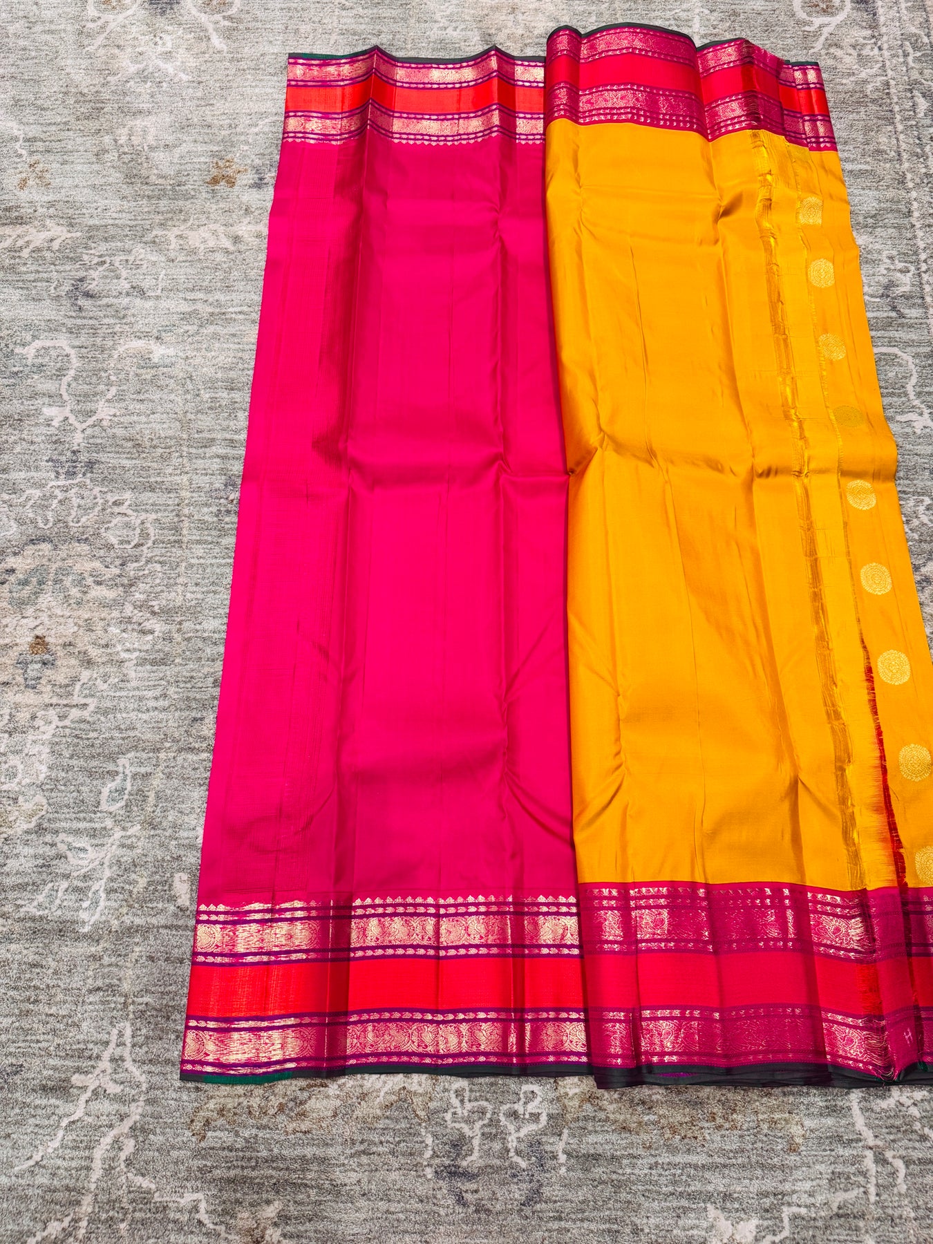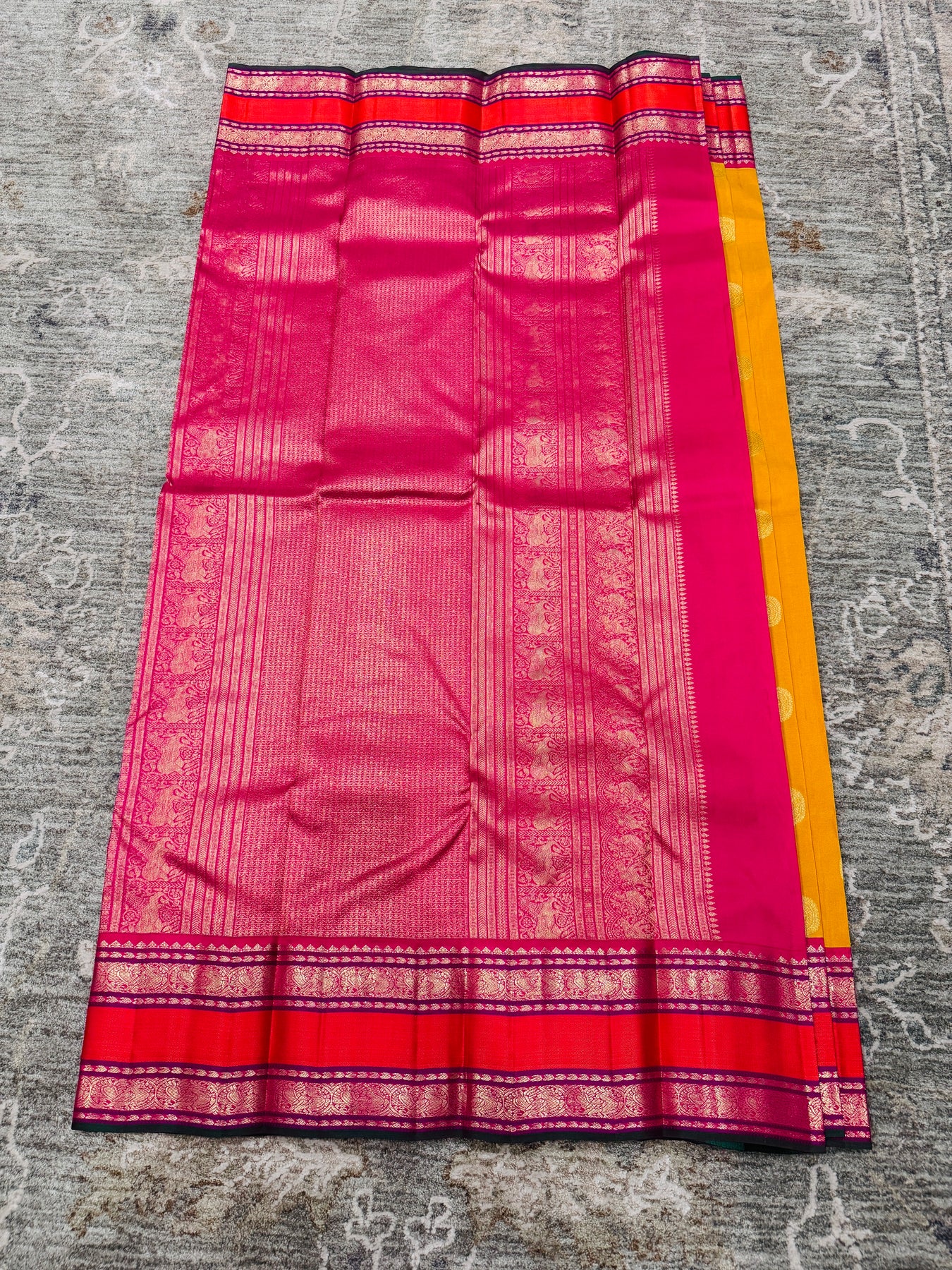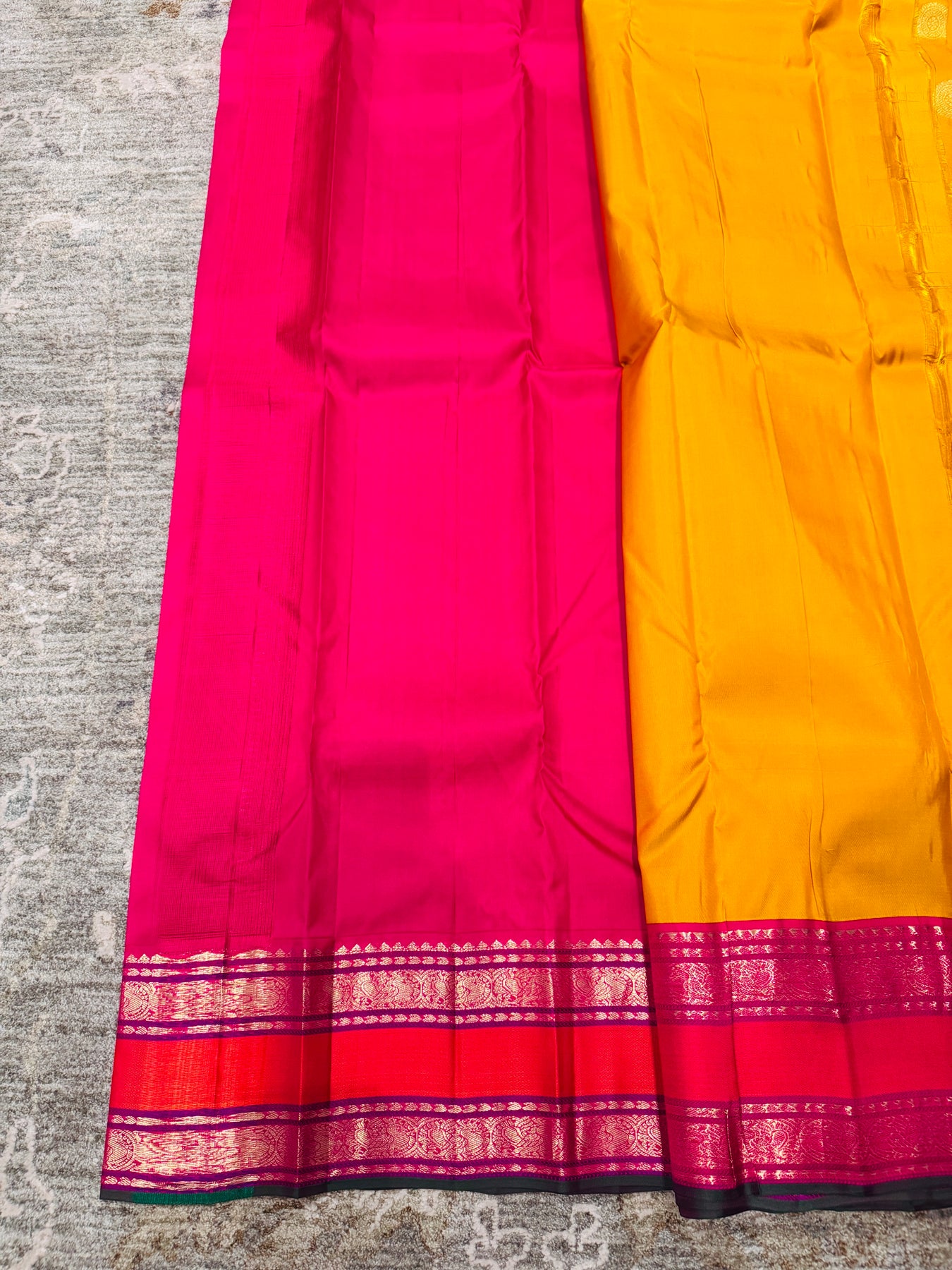 Contrast rani pink border with intricate zari patterns