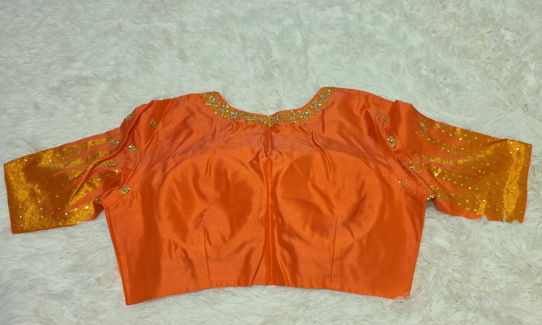 • Blouse: Matching orange blouse with embroidery, sequins, and zari sleeve detailing