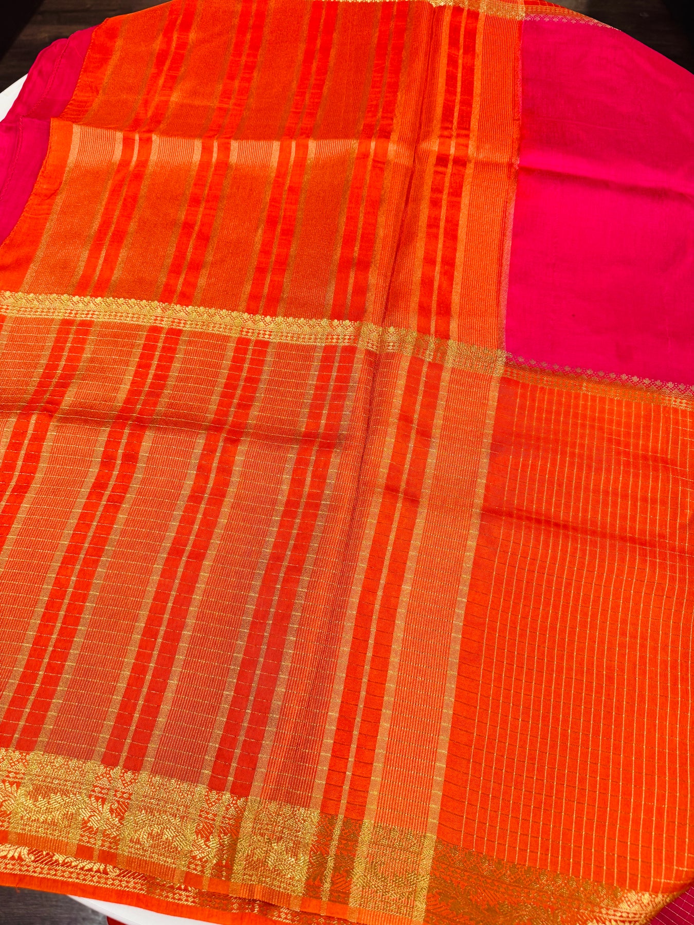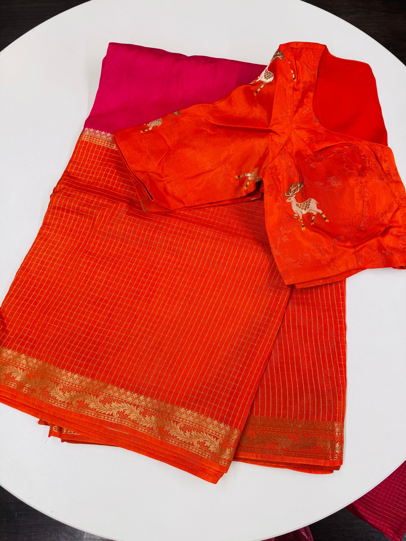 The saree features a rich orange body woven with fine checks, lending it a classic yet contemporary appeal. A delicate gold zari border adds elegance and enhances the overall richness of the drape. The Bright pink pallu and contrast section bring a striking pop of color, beautifully balancing tradition and vibrance.