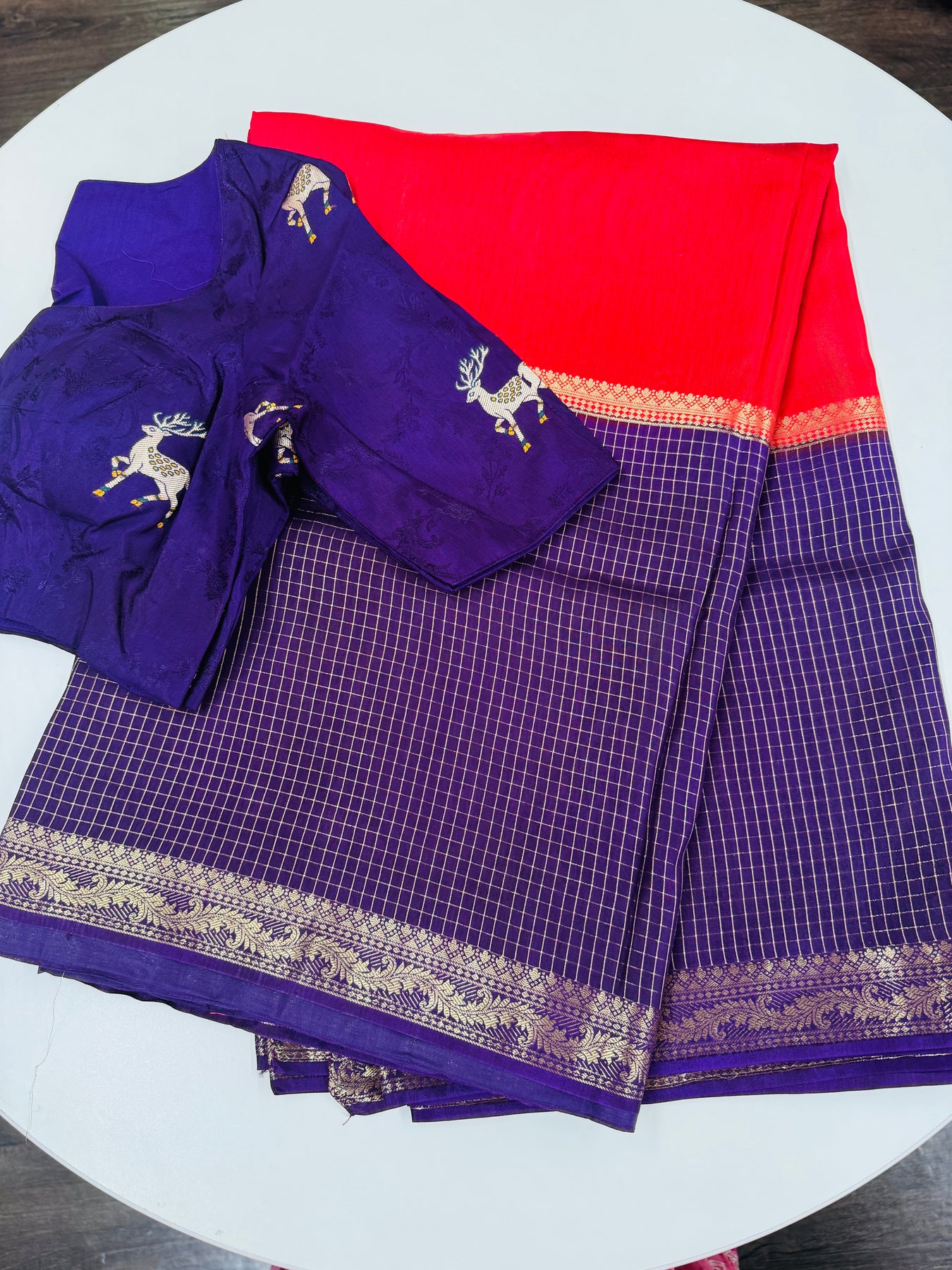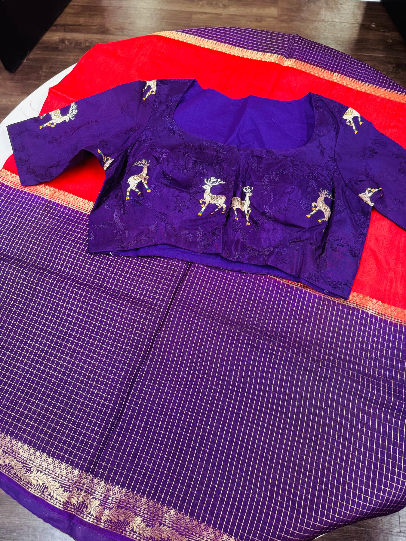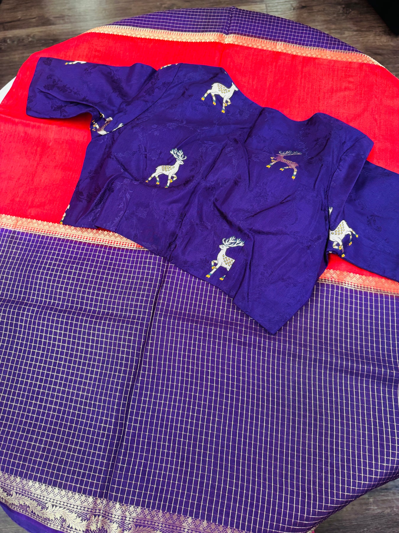 Paired with the saree is a stunning purple designer blouse, highlighted with intricate deer motifs woven across the fabric for a unique, artistic touch. Designed with elbow-length sleeves, the blouse offers a refined traditional silhouette along with a structured fit and elegant neckline for comfort and style.