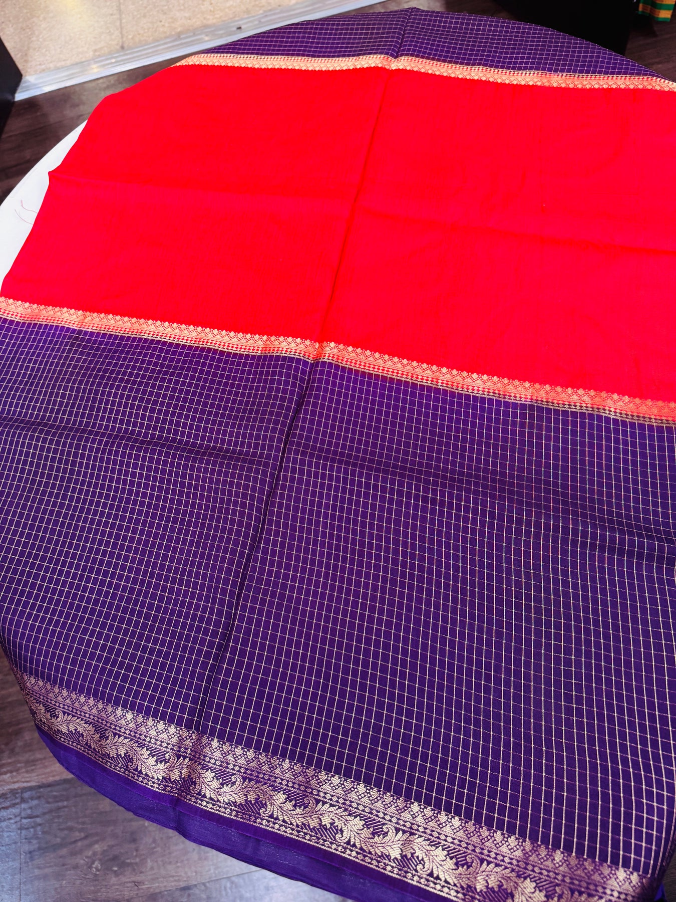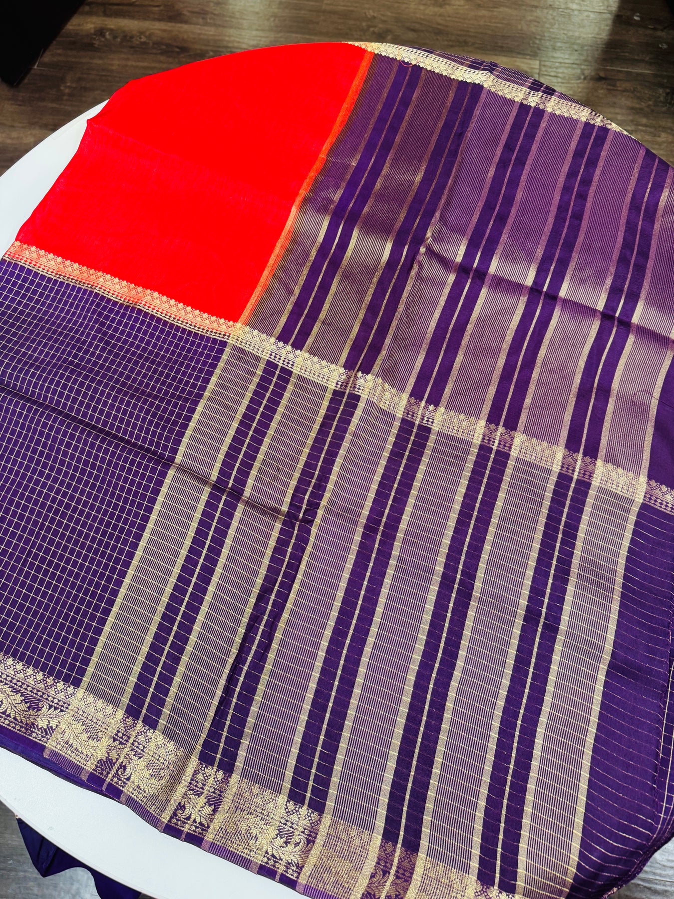 The saree showcases a deep purple body woven with a fine checked pattern, lending it a classic, graceful texture. The vibrant red pallu adds a bold contrast, beautifully enhanced by a contrast panel featuring elegant vertical zari stripes. Finished with a rich gold zari border, the saree exudes a regal charm and drapes effortlessly with a soft sheen.