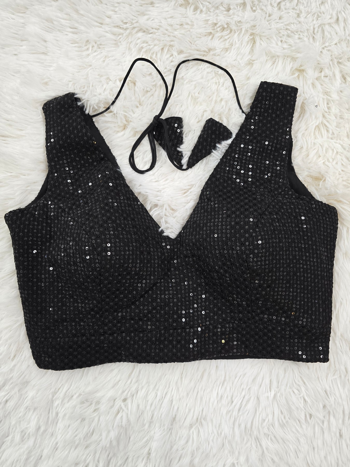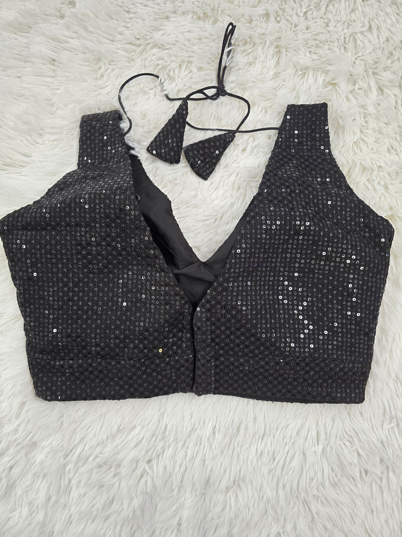 This stunning black sequin blouse is a timeless statement piece designed to elevate any saree look. The blouse features all-over sequin embroidery that shimmers beautifully under light, creating a captivating evening glow. With its deep V-neck on the front and back, thread-tie closure with tasseled ends, and structured padded design, it offers both comfort and elegance. The soft inner lining ensures a smooth fit, making it ideal for festive wear, parties, and wedding celebrations.