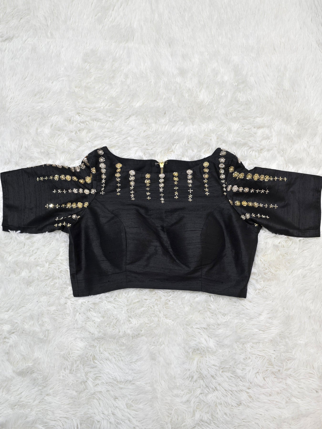 This black silk boat neck blouse is crafted with exquisite maggam work embroidery, featuring shimmering gold and silver floral motifs arranged in vertical patterns across the neckline and sleeves. The rich black silk fabric enhances the intricate handwork, creating a perfect balance of traditional artistry and modern elegance. Designed with elbow-length sleeves and a back zip closure, this blouse is ideal for festive occasions, weddings, and grand celebrations.