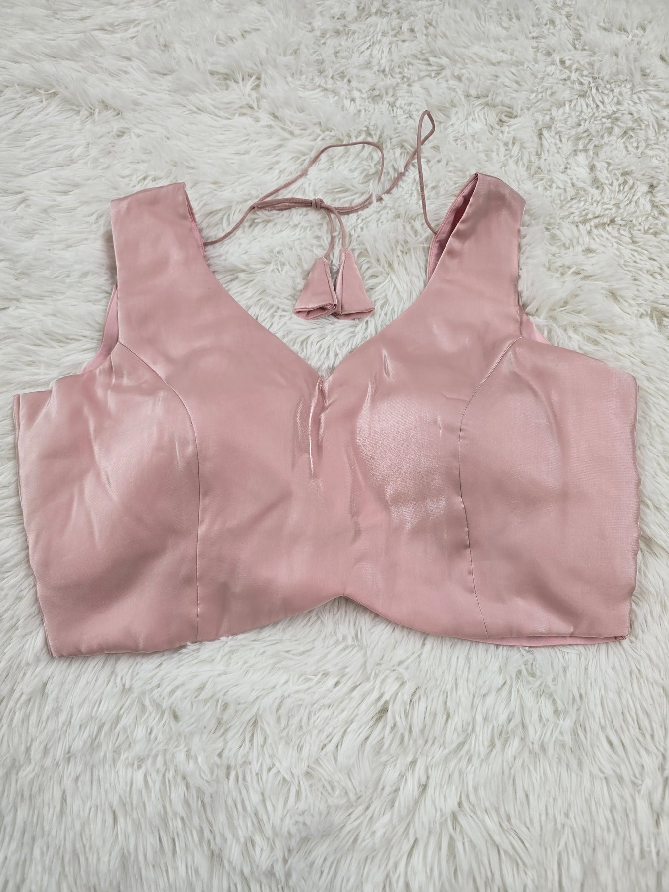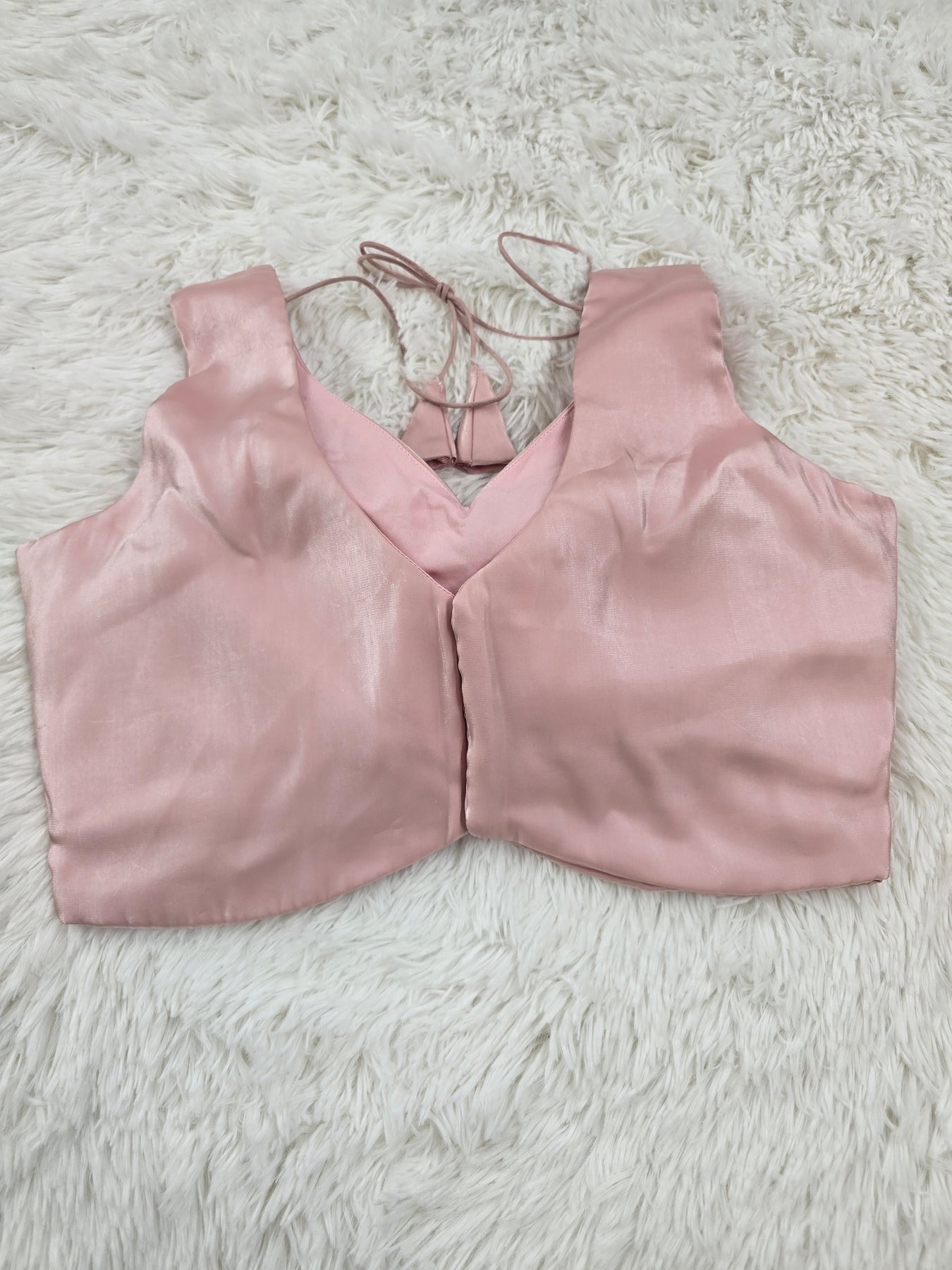 Light Pink Satin Readymade Blouse – Deep V-Neck Design with Back Tie Tassels