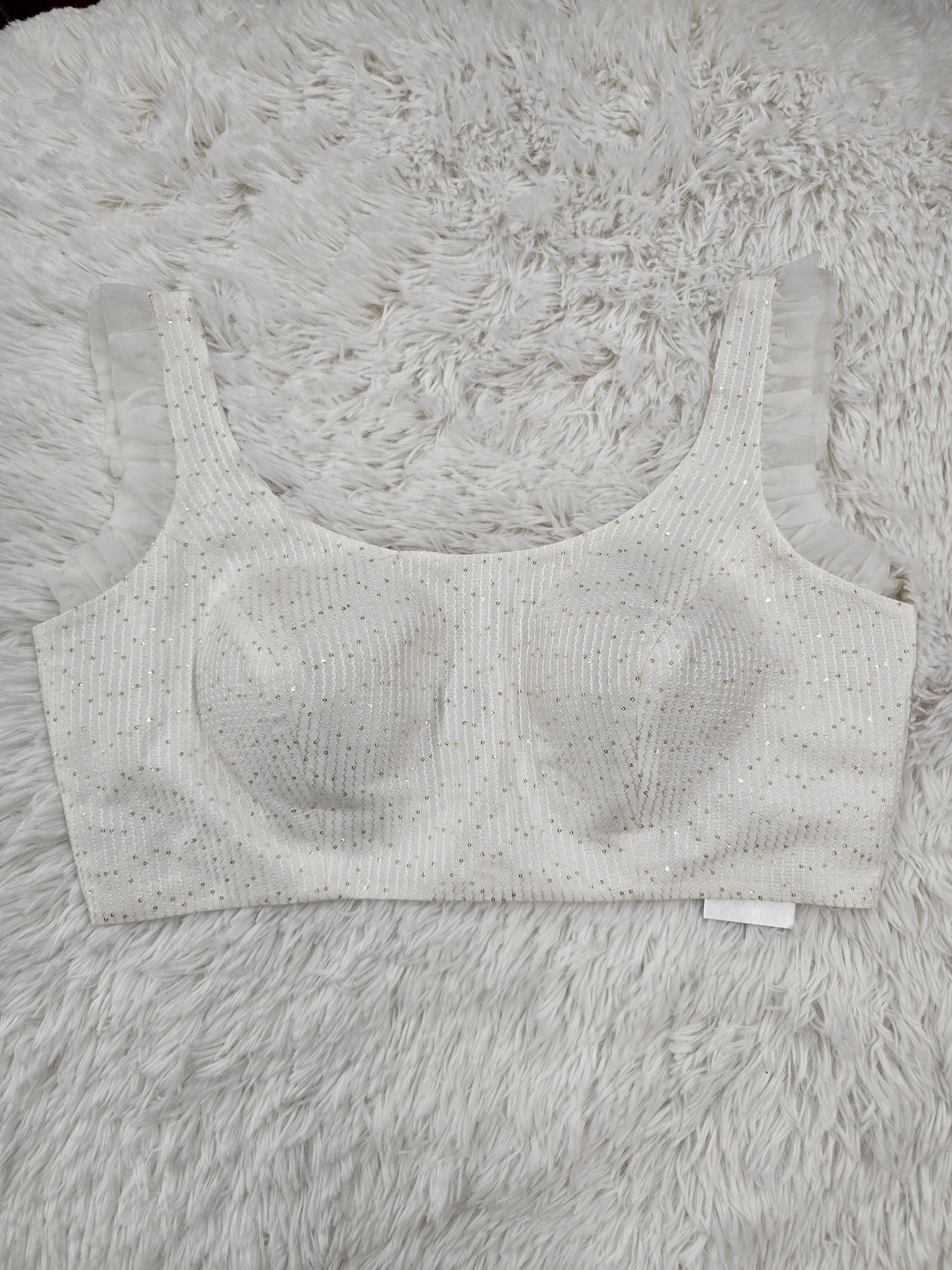 White Sequin Readymade Blouse – Elegant Padded Back Open Designer Blouse with Sheer Ruffle Straps